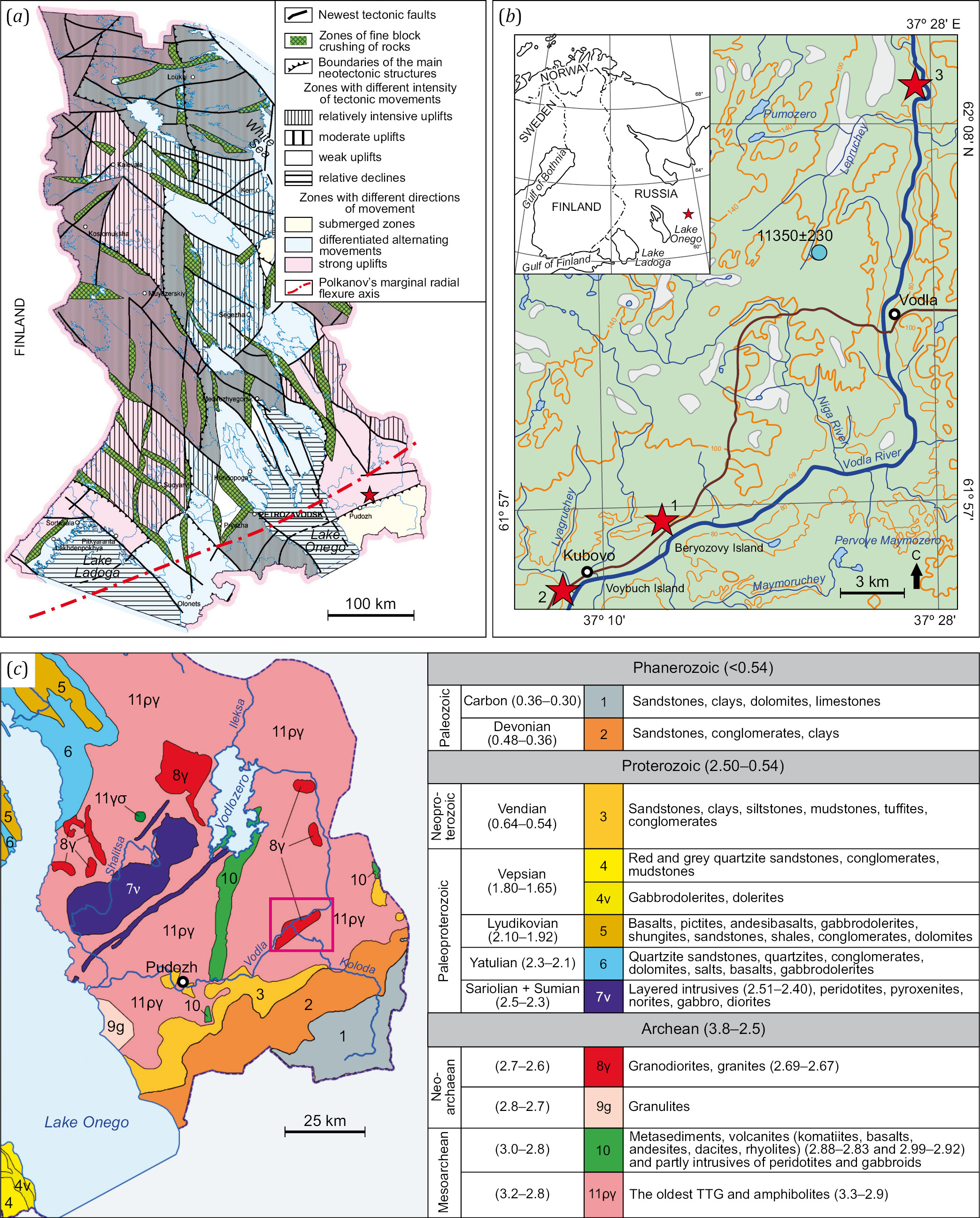 Moreover, they are located within the so-called Polkanov marginal flexure, which is the main element of the tectonic framework of the Fennoscandian Shield junction zone with the Russian Plate and one of the most active tectonic structures in Karelia. The geoflexure controls the location of the Late Cenozoic ice sheet and defines the boundary of the mega-arch uplift of Fennoscandia of modern and all previous epochs of glacioisostasy.The modern epoch is associated with catastrophic phenomena, such as destructive earthquakes and flood zones along the coasts of Holland and Denmark [Sviridenko, 2008]. The position of the axial zone of the Polkanov large radial flexure is shown in Fig. 1, a (after [Zykov, Poleshchuk, 2016; Kolodyazhny et al., 2020].