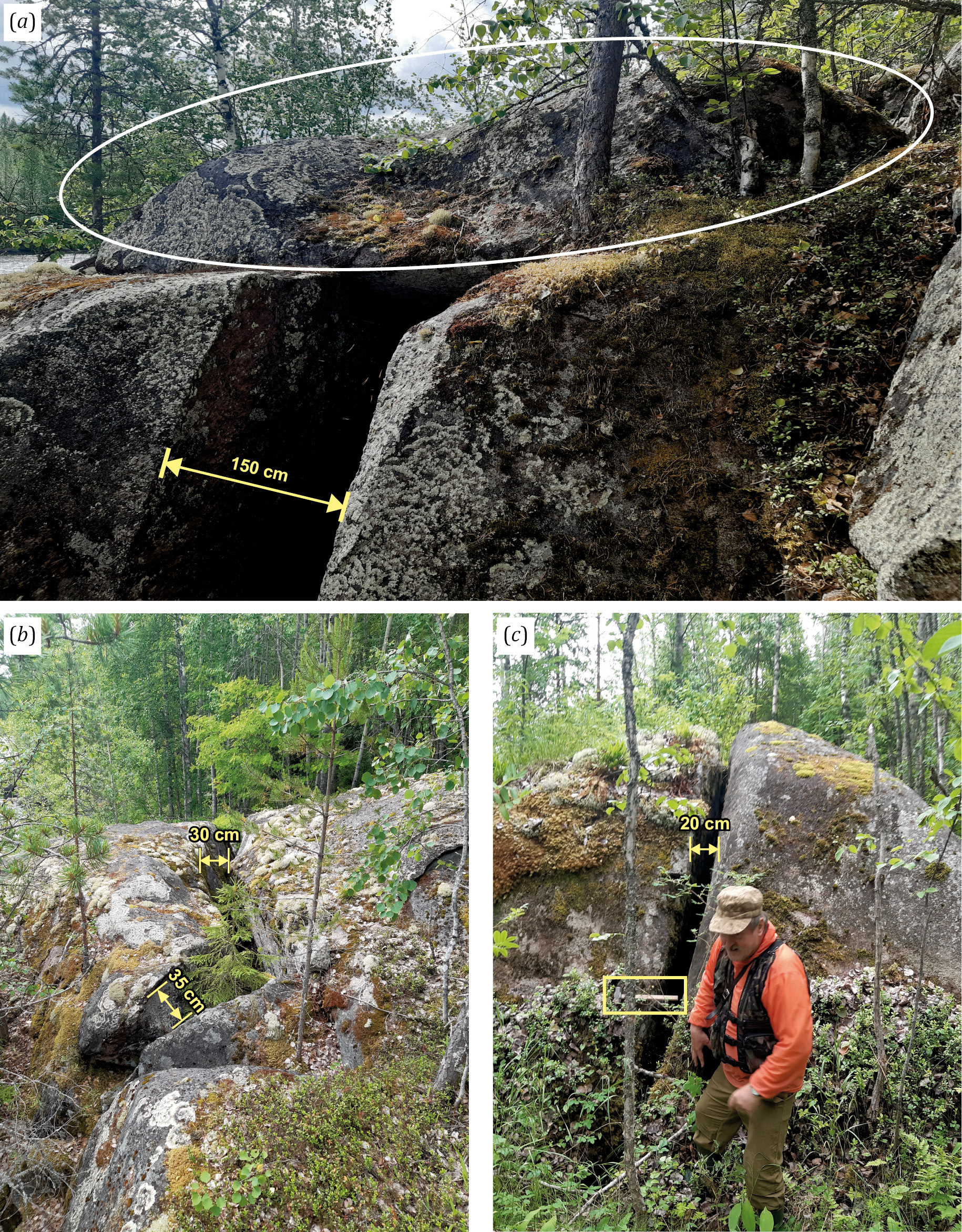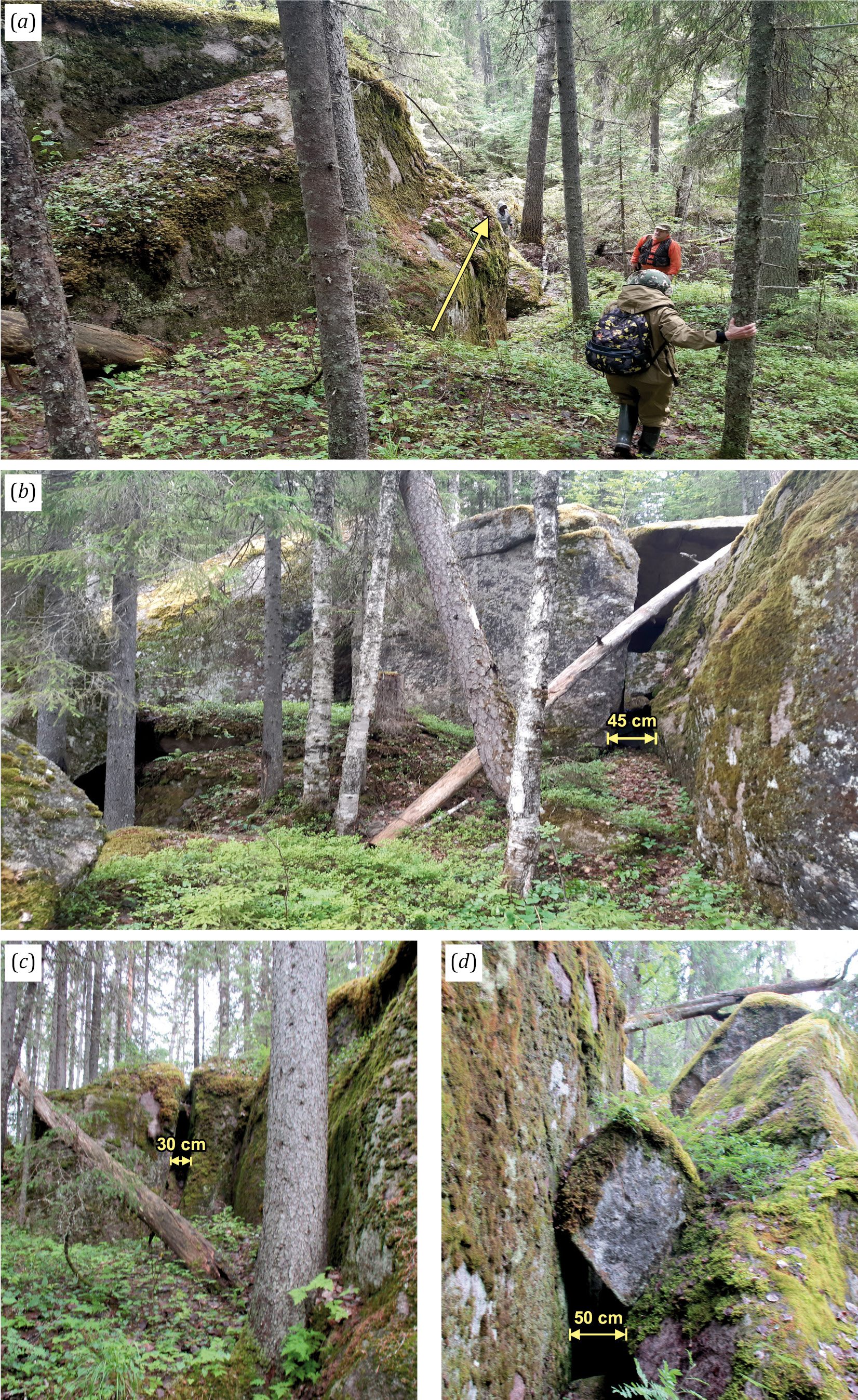 The block surface is polished subdued (reworked by the glacier), but its basement has sharp straight edges. 20–30 cm wide ruptures in crystalline rocks occur behind the "cave" (61°55'55.79" N; 37°08'04.73" E) (Fig. 6, b, c).