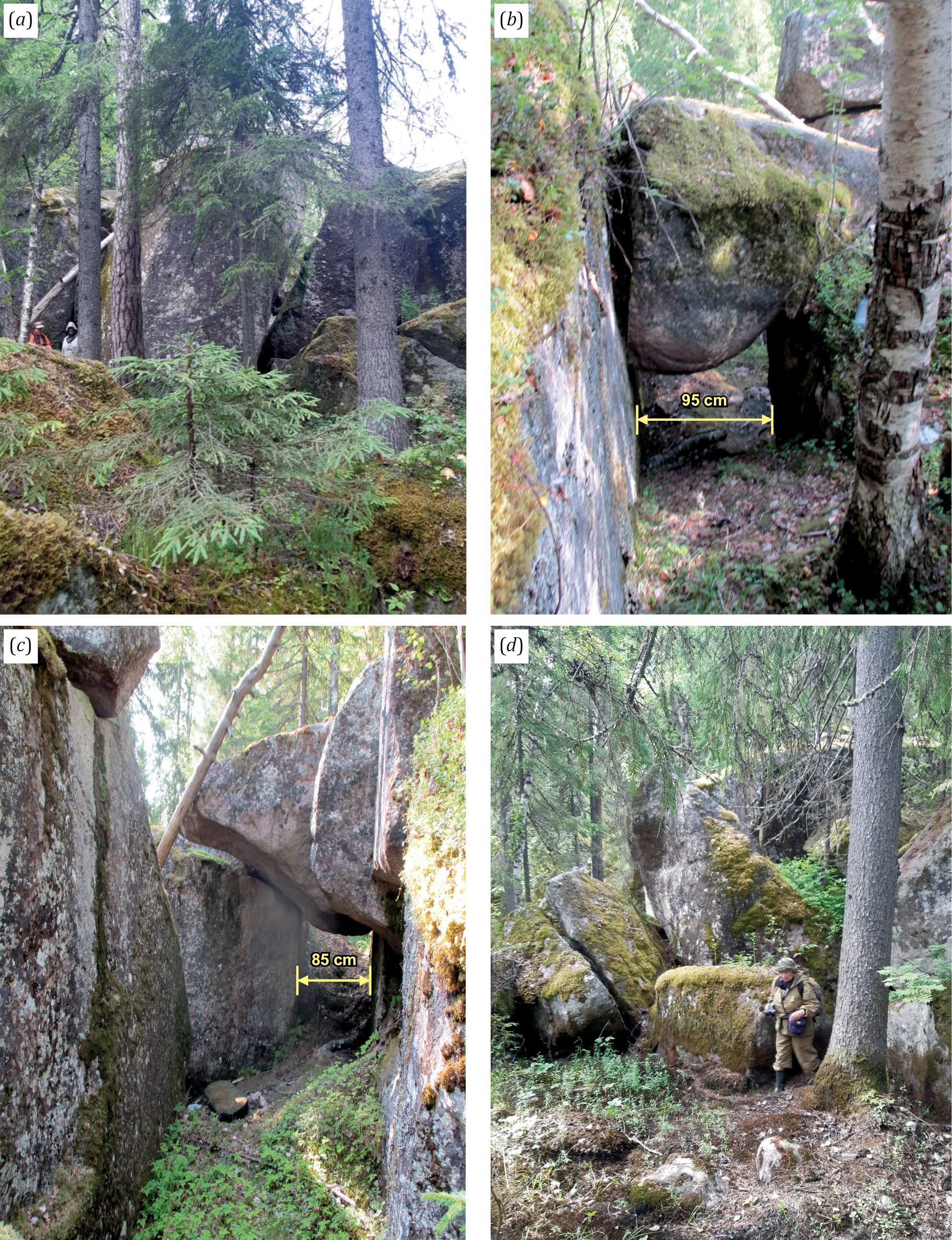 Also noteworthy are the ruptures in the crystalline rocks near the Padun Waterfall (61°56'04.98" N; 37°08'17.22" E; see Fig. 1, в (3), Fig. 2, d (claster 3); Fig. 7, а–d). The apparent length of the ruptures is approximately 100 m; in some places, they are 40 cm wide.