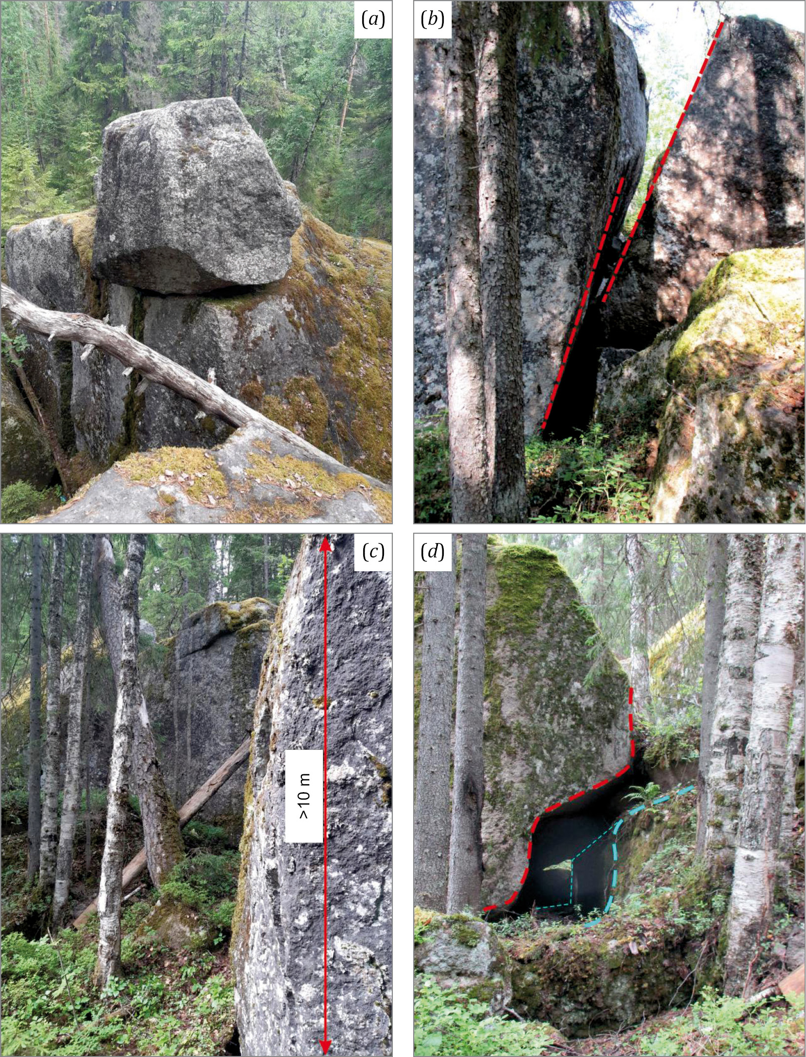(a) – a block of rock on the fractured top surface at the very edge of the fault, the apparent depth of the fracture is more than 2 m; (b) – a detached block of rock that has slid down the slope; (c) – a scarp with a height of >10 m; (d) – a detached and removed block.