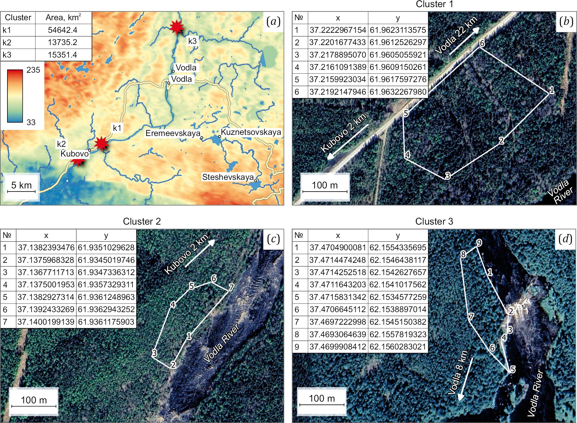 Fig. 2. Location, areas (a), and boundaries of the study objects (b, c, d). Сlusters k1, k2, and k3 are marked by stars No. 1, 2, and 3 in Fig. 1, b.