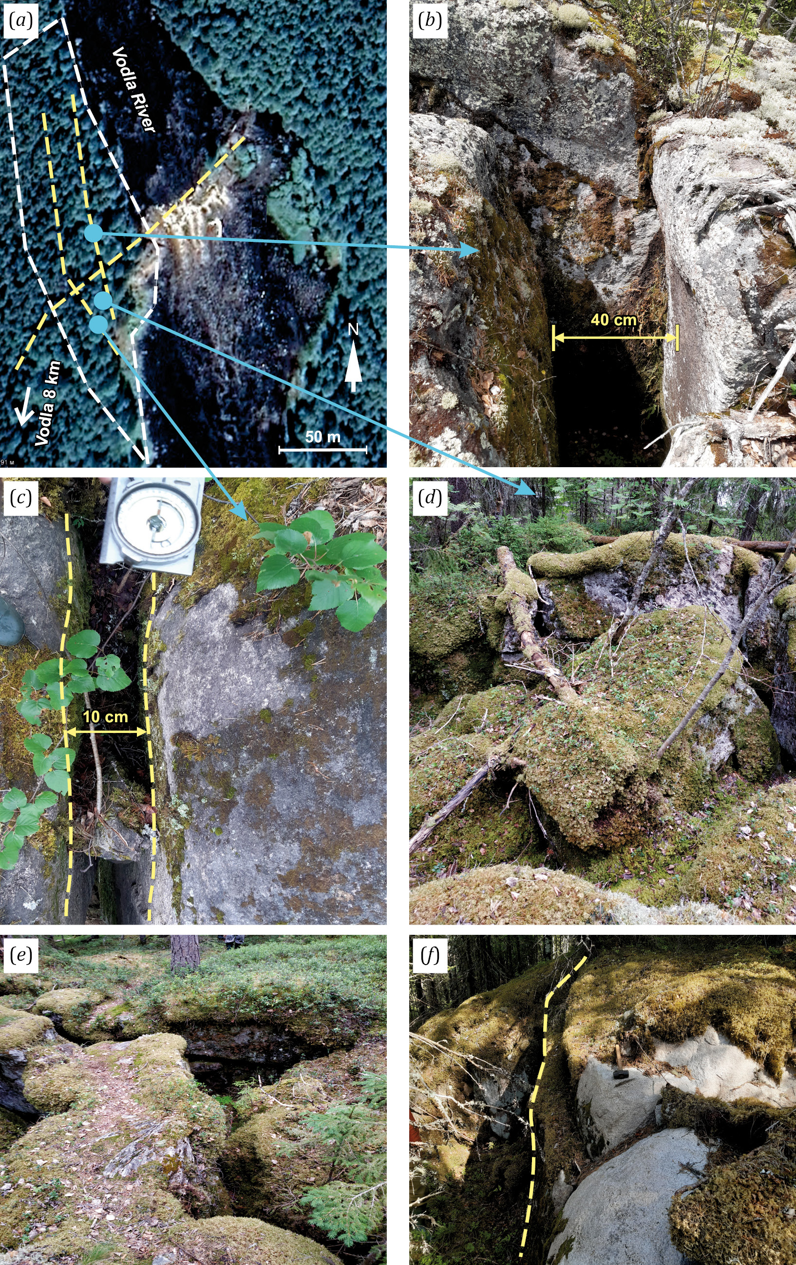 (a) – Padun Waterfall in the satellite image. The yellow dotted lines show the faults; the blue lines show the points where photos (b–d) were taken; (b, c) – a fragment of a long fault near the Padun Waterfall; an apparent depth is more than 2 m; (d) – crushed part of the rocks; (e, f) – fractures (faults) on cluster 1.