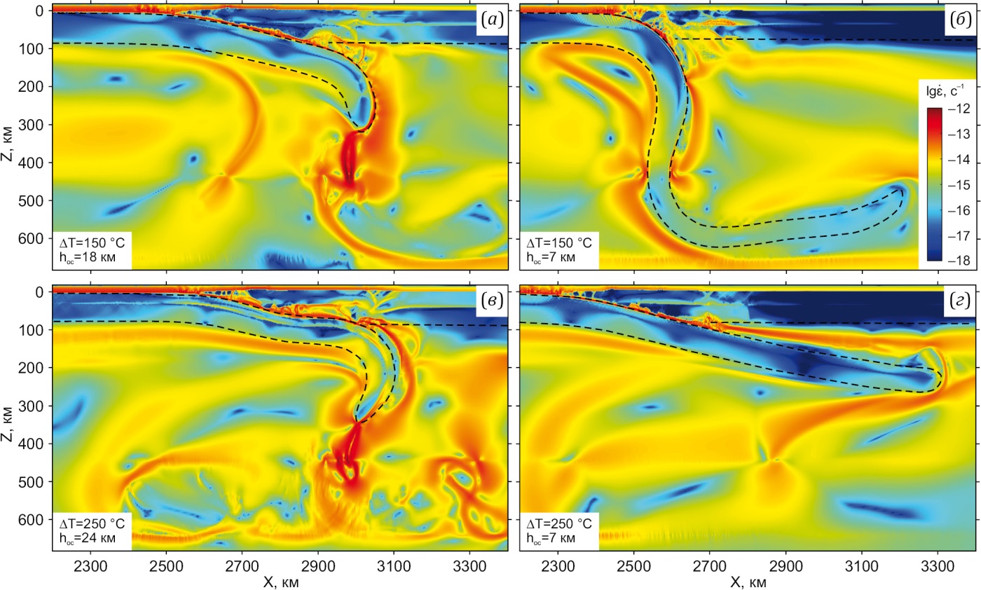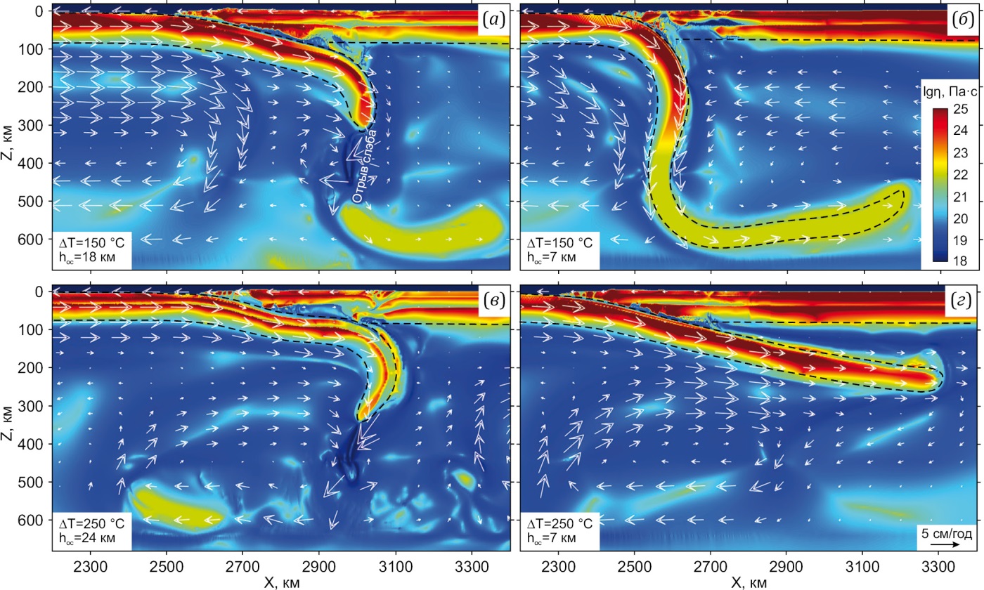 Реологическое расслоение литосферы для моделей с ∆T=150 и 250 °C проявляется в чередовании слоев повышенной и пониженной вязкости (см. рис. 4) и скорости деформации (рис. 5). Это расслоение проявлено для континентальной литосферы (слой пониженной вязкости в нижней континентальной коре), а также и для океанической в моделях с толстой корой (см. рис. 4, а, в; рис. 5, а, в). Области активной деформации литосферы выражаются в виде концентрированных узких зон пониженной вязкости и повышенной скорости деформации, которые соответствуют разломным структурам. Поле течений в верхней мантии левее зоны субдукции согласуется с движением субдуцирующей литосферной плиты, а в переходной зоне мантии формируется возвратный поток. Отрывы фрагментов слэба (см. рис. 2, а, д) вызывают значительное возмущение поля скорости (см. рис. 4, а, в) и деформации (рис. 5, а, в) в верхней мантии. Откат слэба в модели с ∆T=150 °C с тонкой корой (см. рис. 4, б) выражается в обратном потоке верхнемантийного вещества правее зоны субдукции. В модели с ∆T=250 °C с тонкой корой слэб обладает большей вязкостью и прочностью (см. рис. 4, г), вследствие этого он слабо деформирован (рис. 5, г), его пологое ровное погружение вызывает согласованное движение вещества верхней мантии в том же направлении (см. рис. 4, г).