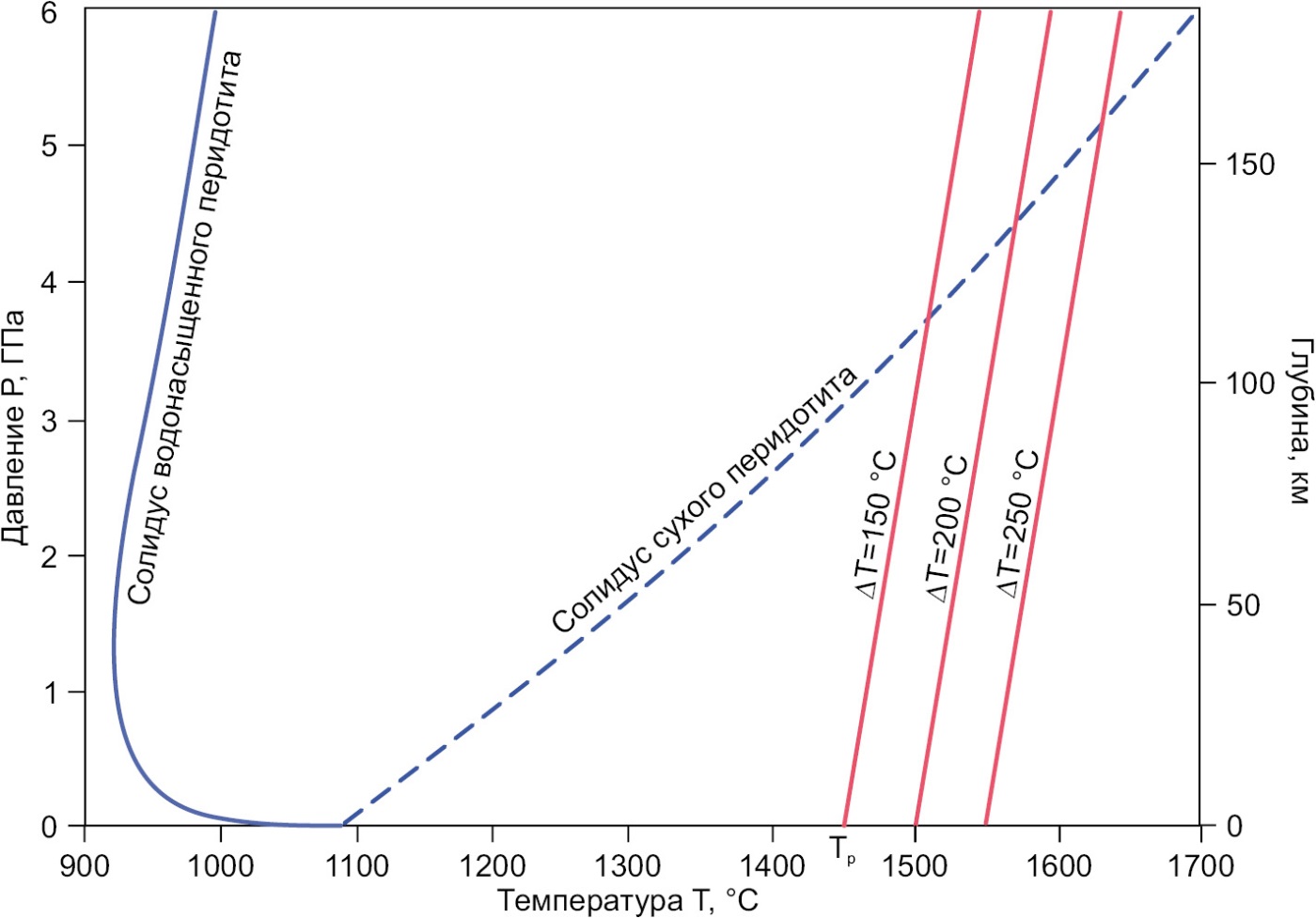 Красные линии – мантийные адиабаты для моделей с потенциальной температурой мантии Tp=1450 °C (∆T=T–Tсовр=150 °C), Tp=1500 °C (∆T=200 °C), Tp=1550 °C (T=250 °C) и адиабатическим градиентом 0.5 °C/км.