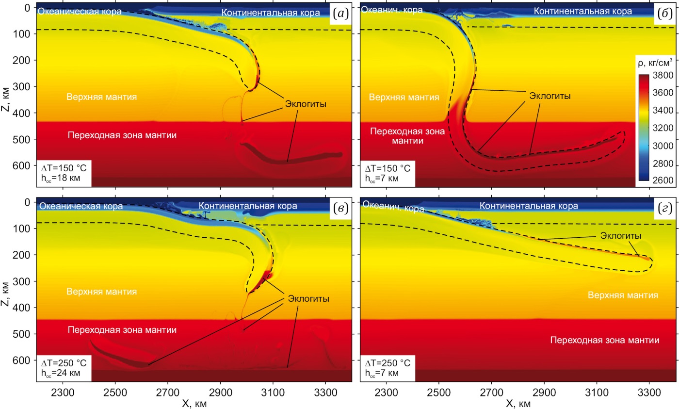 Важным элементом модели является дискретная эклогитизация слоев океанической коры – меньшая кинетическая задержка эклогитизации в водосодержащем базальтовом слое, по сравнению с более сухим нижележащим габбровым слоем [Perchuk et al., 2023]. Раcчеты выполнялись для модели с дискретной эклогитизацией, в которой задавались диапазоны температуры прохождения эклогитового перехода 450–650 и 600–800 °С для базальтового и габбрового слоев океанической коры соответственно [Perchuk et al., 2023; Zakharov et al., 2024].