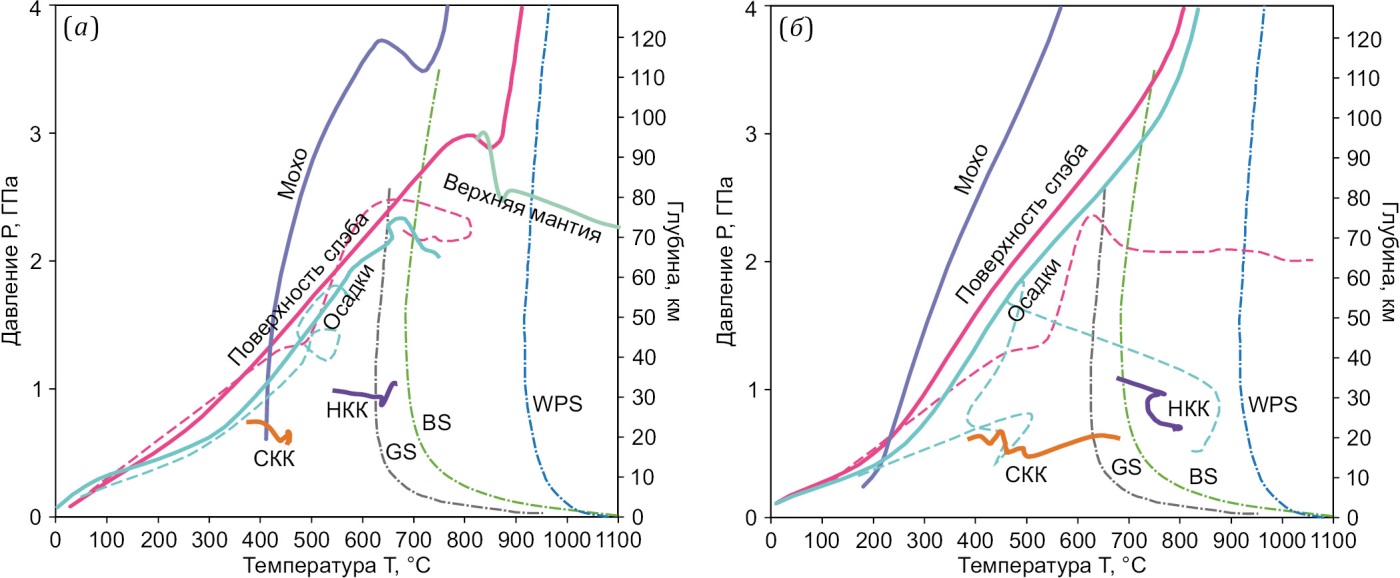 (а) – hoc=18 км, (б) – hoc=7 км. Представлены тренды для поверхности слэба (красные линии), нижней границы океанической коры (фиолетовые линии), осадков (голубые линии), фрагментов нижней (НКК) и средней (СКК) континентальной коры, верхней мантии (зеленые линии). Штриховыми линиями соответствующего цвета показаны тренды для отслоенных фрагментов базальтов и осадков. Показаны кривые солидуса: WPS – водонасыщенного перидотита (по [Katz et al., 2003]), BS – базальта (по [Schmidt, Poli, 1998]), GS – фельзических пород (по [Till et al., 2012]).