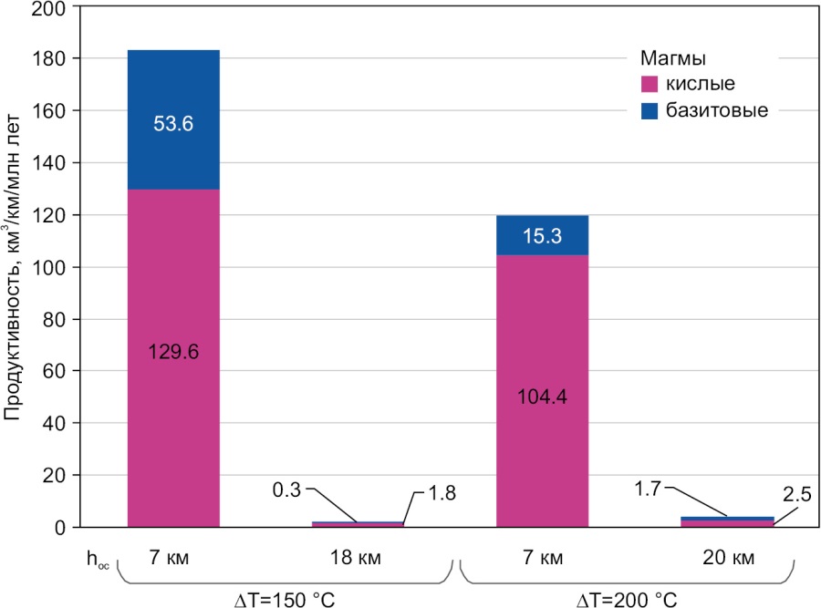 Средняя продуктивность магматизма (рис. 7) в модели при ∆T=150 °C с корой мощностью 7 км (за период 11–20 млн лет модельного времени) составила 183 км³/км/млн лет, среди которых 130 км³/км/млн лет приходится на кислые, а 53 км³/км/млн лет на базитовые магмы, в то время как в модели с корой 18 км за тот же период средняя продуктивность 2.1 км³/км/млн лет (1.8 и 0.3 км³/км/млн лет для кислых и базитовых магм соответственно). В модели при ∆T=200 °C, несмотря на более высокую температуру мантии, средняя продуктивность была несколько меньше – 120 км³/км/млн лет, причем для кислых магм – 105 км³/км/млн лет, для базитовых – 15 км³/км/млн лет, в то время как в модели с корой 20 км за тот же период средняя продуктивность 4.2 км³/км/млн лет (2.5 и 1.7 км³/км/млн лет для кислых и базитовых магм соответственно). Эти оценки согласуются с качественным результатом, представленным в работе [Perchuk et al., 2023], где в моделях докембрийской пологой субдукции под континент с толстой корой наблюдался только весьма ограниченный и кратковременный магматизм.