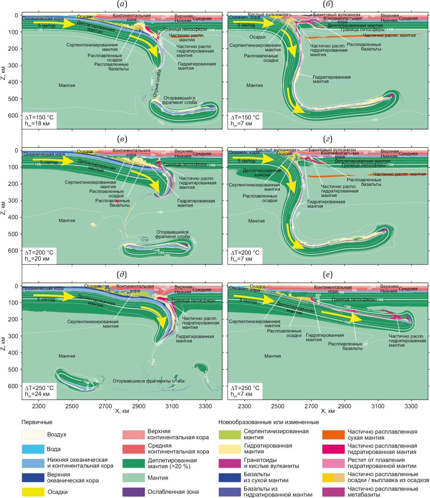 Для выявления влияния мощности океанической коры на особенности субдукции для каждого варианта потенциальной температуры мантии выполнена серия численных 2D-экспериментов для толстой (18–24 км) и для тонкой (7 км) докембрийской океанической коры. Мощность толстой коры hoc при разных ∆T принималась в соответствии с данными [Weller et al, 2019], тонкой коры – в соответствии с современными значениями. Для моделей при ∆T=150 °C мощность коры hoc варьировалась от 18 до 7 км, при ∆T=200 °C hoc – от 20 до 7 км, при ∆T=250 °C – от 24 до 7 км.