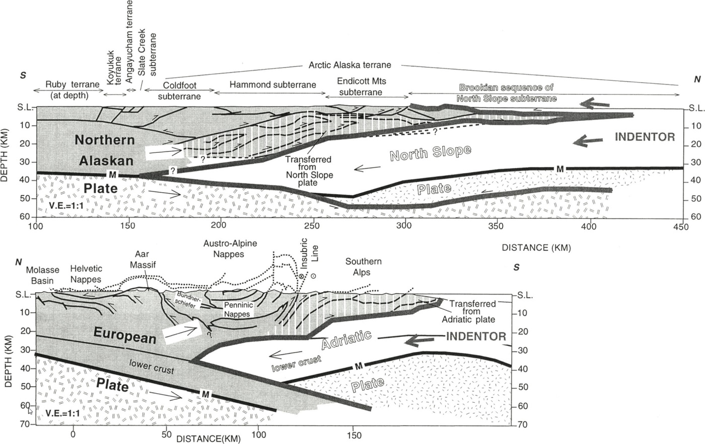 Fig. 5. Geological and geophysical profiles through the collisional orogens of the Brooks Range (Alaska) (top) and the Alps (bottom) from [Fuis et al., 1997]. The gray color shows the crust of the indented plate, white color – the crust of the indentor plate; double hatch marks indicate the mantle of the indented plate, single hatch marks – the indentor plates. The thick gray line separates the indented plates (Northern Alaskan and European) from the indentor plates (North Slope and Adriatic). The transformed complexes of the indentor plate, incorporated into the indented plate, are indicated with white vertical lines.