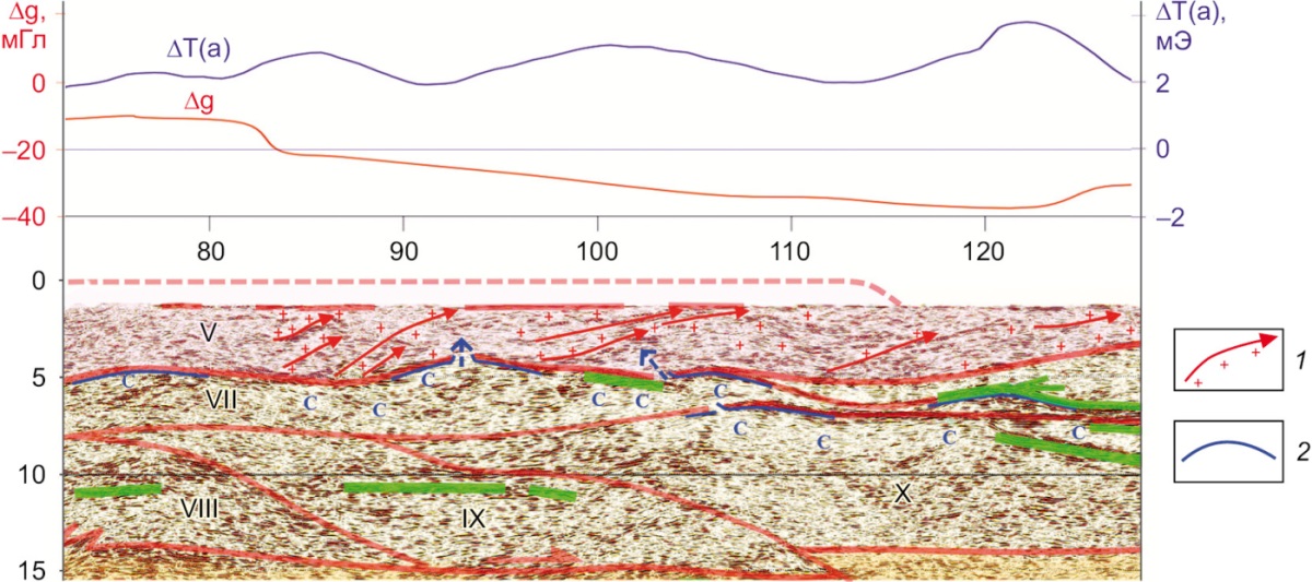 На рассматриваемом участке профиля обращают на себя внимание линейные зоны резко повышенного уровня сейсмического сигнала (показаны зеленым цветом на рис. 2, 3), отражающие, вероятно, силлы габброидов, которые также находят отражение в потенциальных полях, в первую очередь в магнитном поле, вызывая интенсивные положительные аномалии. Такой характер отражения в магнитном поле, нахождение вне связи с мантийными колоннами в фундаменте, возникшими в коллизионную стадию, и близость к выходам дорифейских комплексов в V пластине (см. рис. 1) позволяют отнести эти габброиды к медвежевскому комплексу рифея.