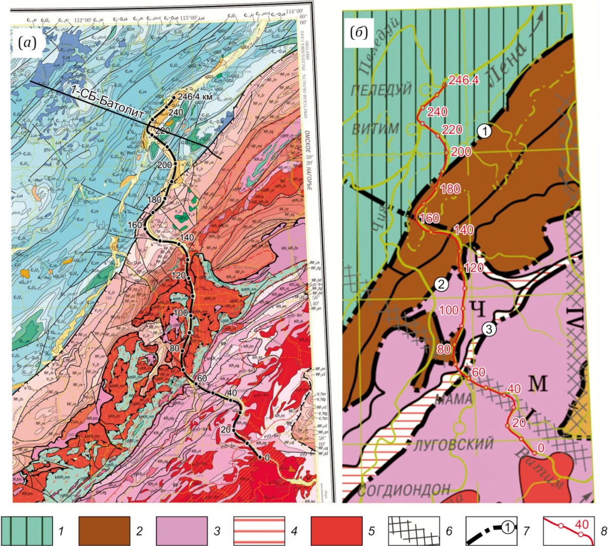 The structures on the scheme: 1 – Siberian platform, Prilensky structural zone; 2–5 – Baikal-Patom fold-and-thrust belt: 2 – Pribaikal-Patom pericratonic trough, 3: Ч – Chuya uplift (allochthon) of the pre-Riphean basement, М – Mama block, 4 – Levaya Minya-Chuya dynamometamorphic zone, 5 – Angara-Vitim granitoid areal-pluton; 6 – fault systems identified from the satellite images; 7 – major crustal faults: 1 – Akitkan-Dzherba, 2 – Alekan, 3 – Chuya; 8 – line for profiling pickets (river section begins from PK-72 km).