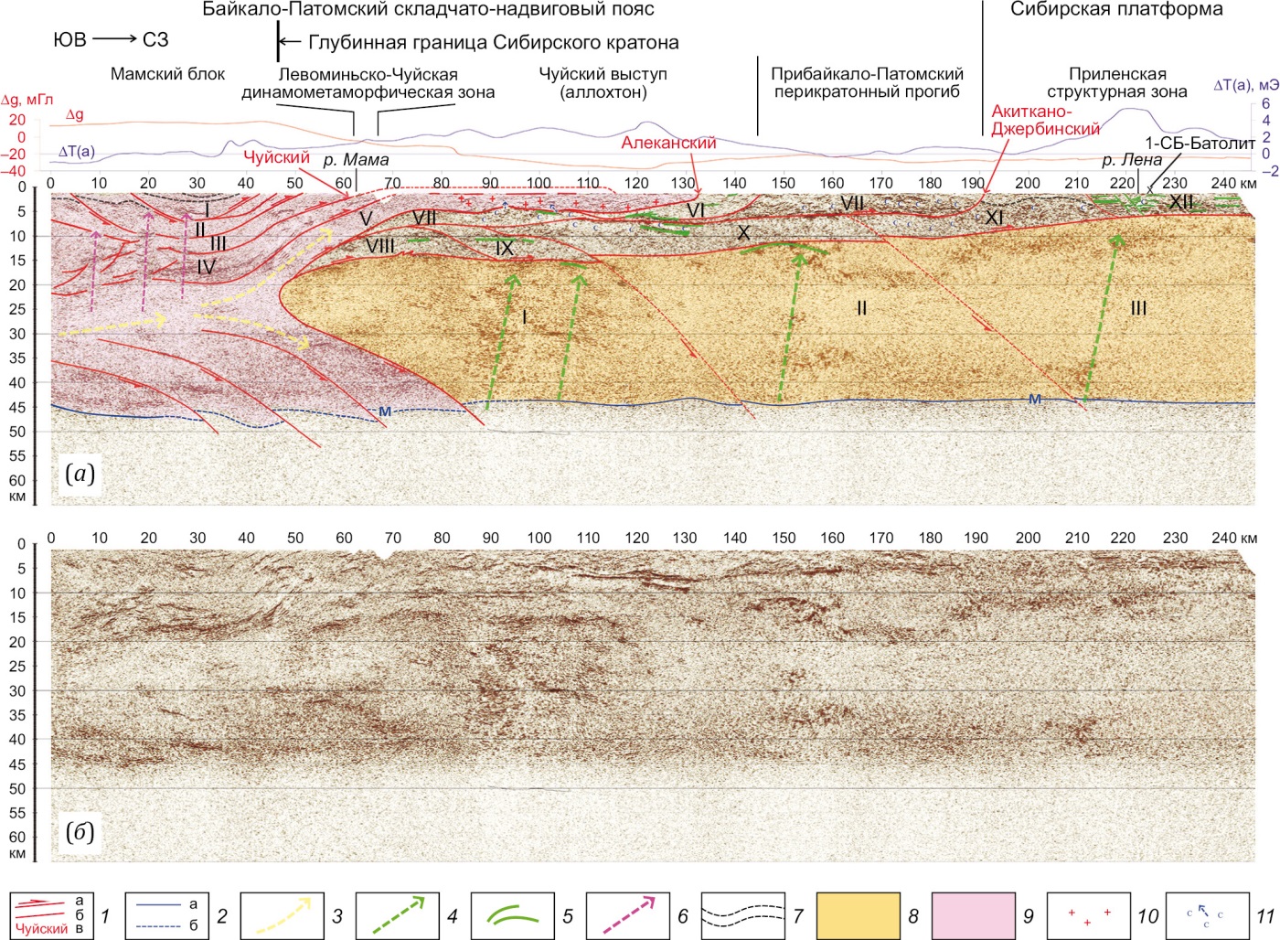 Рис. 2. Геодинамическая модель глубинного строения юго-восточной окраины Сибирского кратона и пограничных структур Байкало-Патомского складчато-надвигового пояса (а) на основе сейсмического разреза МОВ-ОГТ (б) по фрагменту опорного геофизического профиля 1-СБ-Восточный (названия и границы структур по [State Geological Map…, 2012], с изменениями).