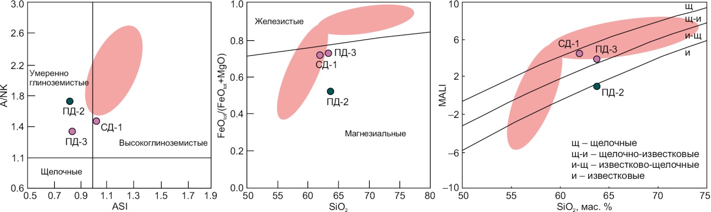 Fig. 4. Diagram in ASI – A/NK, SiO2 – FeO/(FeO+MgO) and SiO2 – MALI coordinates [Frost et al., 2001] for magmatic rocks of the Tytylveem Depression. See Fig. 3 for legend.