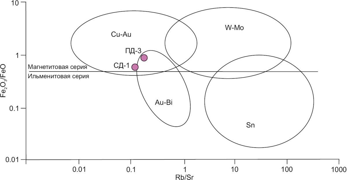 Низкая и умеренная глиноземистость монцонитов, принадлежность к щелочно-известковой высококалиевой серии, соотношение Fe2O3/FeO и Rb/Sr (рис. 9), повсеместная мелковкрапленная минерализация пирита и халькопирита в них, а также структурно-геологическая позиция в основании Тытыльвеемской впадины позволяют предполагать, что монцониты могут принадлежать ПЭС, включающей месторождения Двойное и Сентябрьское.