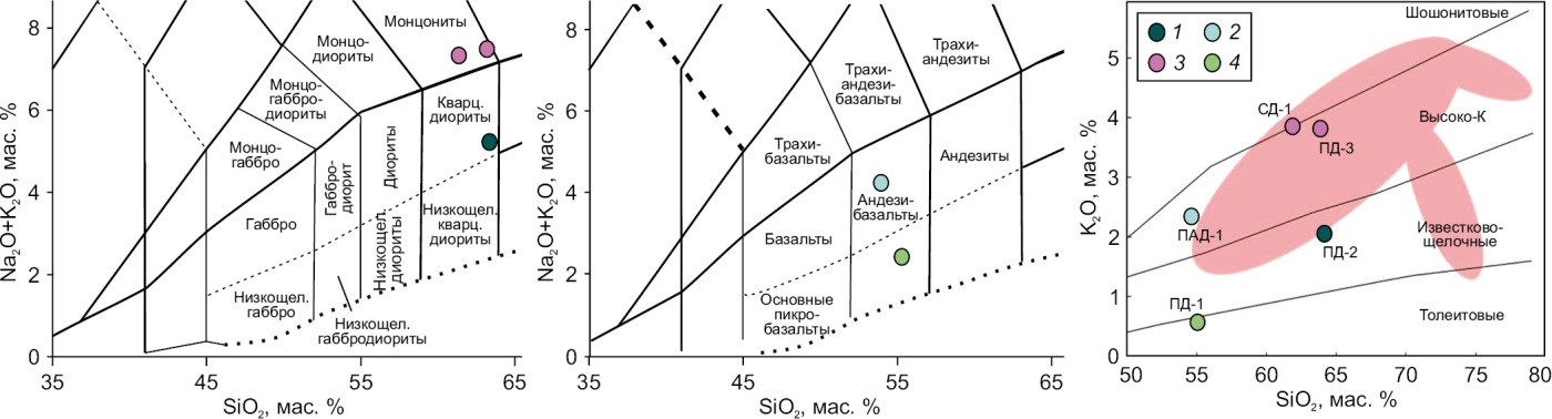 1 – quartz diorites of the Ichuveem complex; 2 – dolerites of the Tytylveem subvolcanic complex; 3 – monzonites of the Chukotka complex; 4 – basaltic andesites of the Tytylveem formation. The compositional field of the Tytylveem formation volcanic rocks (after [Tikhomirov et al., 2017]) is shown with a pink field.
