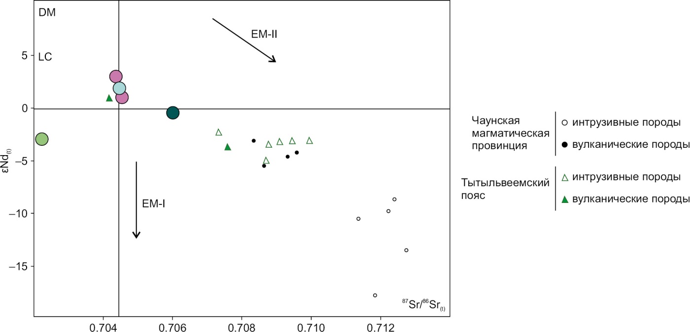 Положительные значения εNd(t) и низкие значения ⁸⁷Sr/⁸⁶Sr отношения монцонитов чукотского комплекса и долеритов тытыльвеемского субвулканического комплекса указывают на наибольший вклад мантийного источника относительно других пород Тытыльвеемского пояса.