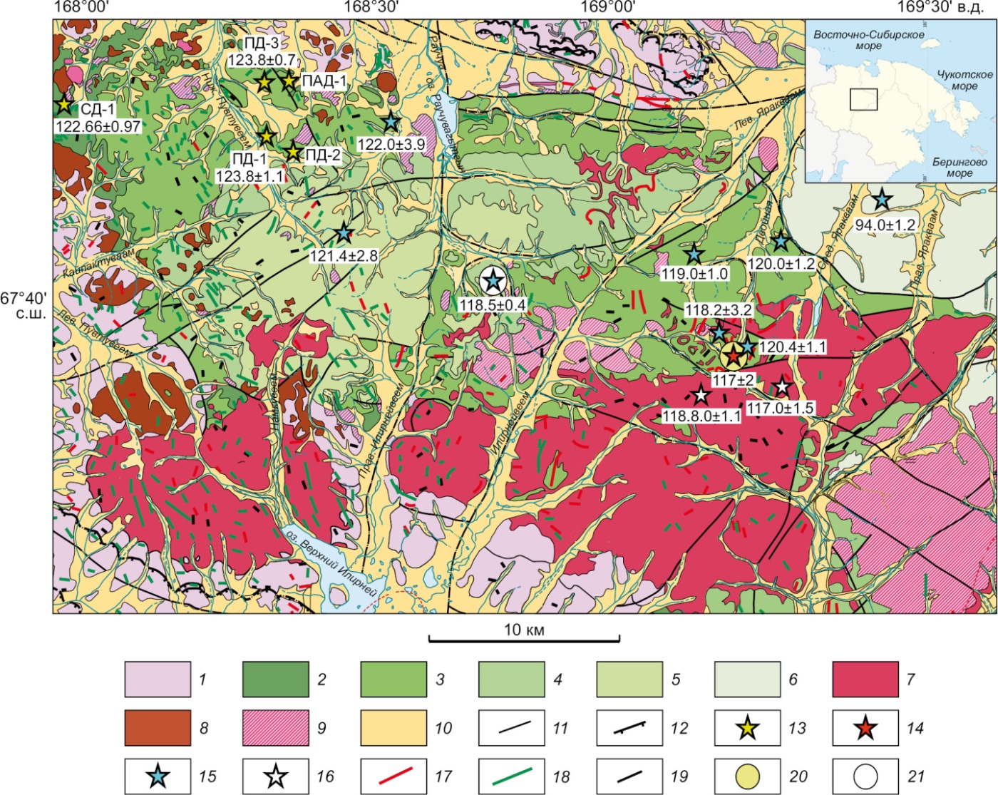 1 – триасовые отложения; 2 – эгилькнывеемская свита; 3 – нижняя подсвита тытыльвеемской свиты; 4 – средняя подсвита тытыльвеемской свиты; 5 – верхняя подсвита тытыльвеемской свиты; 6 – пучевеемская свита; 7 – илирнейский комплекс; 8 – чукотский комплекс; 9 – субвулканический тытыльвеемский комплекс; 10 – четвертичные образования; 11 – разломы; 12 – надвиги; 13 – точки наблюдений с U-Pb датировками магматитов (данная работа); 14 – ⁴⁰Ar/³⁹Ar датировка адуляра Au-Ag жилы месторождения Двойное [Thomson et al., 2022]; 15 – U-Pb датировки циркона вулканитов тытыльвеемской свиты [Tikhomirov et al., 2017; Akinin et al., 2015]; 16 – U-Pb датировки циркона интрузивных образований [Sakhno et al., 2016, 2019]; 17 – дайки тытыльвеемского комплекса; 18 – дайки ичувеемского комплекса; 19 – кварцевые жилы; 20 – месторождение Двойное; 21 – месторождение Сентябрьское.