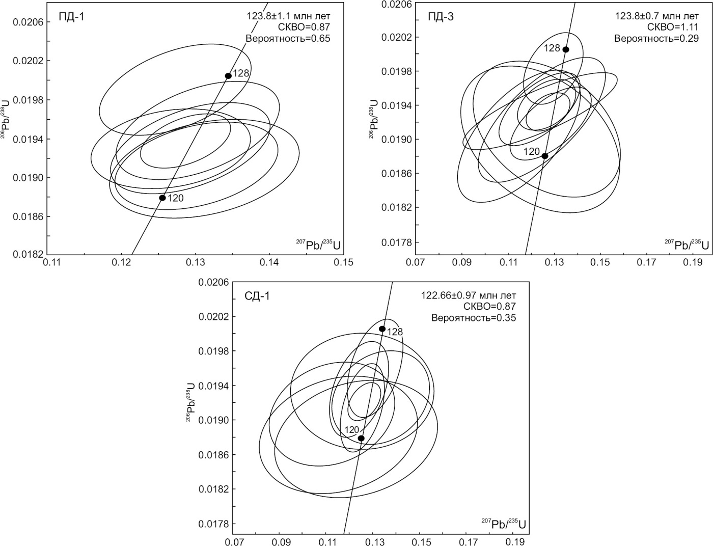 Изотопно-геохронологические исследования U-Pb методом по цирконам проведены на масс-спектрометре SHRIMP-II в Центре изотопных исследований при Институте Карпинского (г. Санкт-Петербург).
