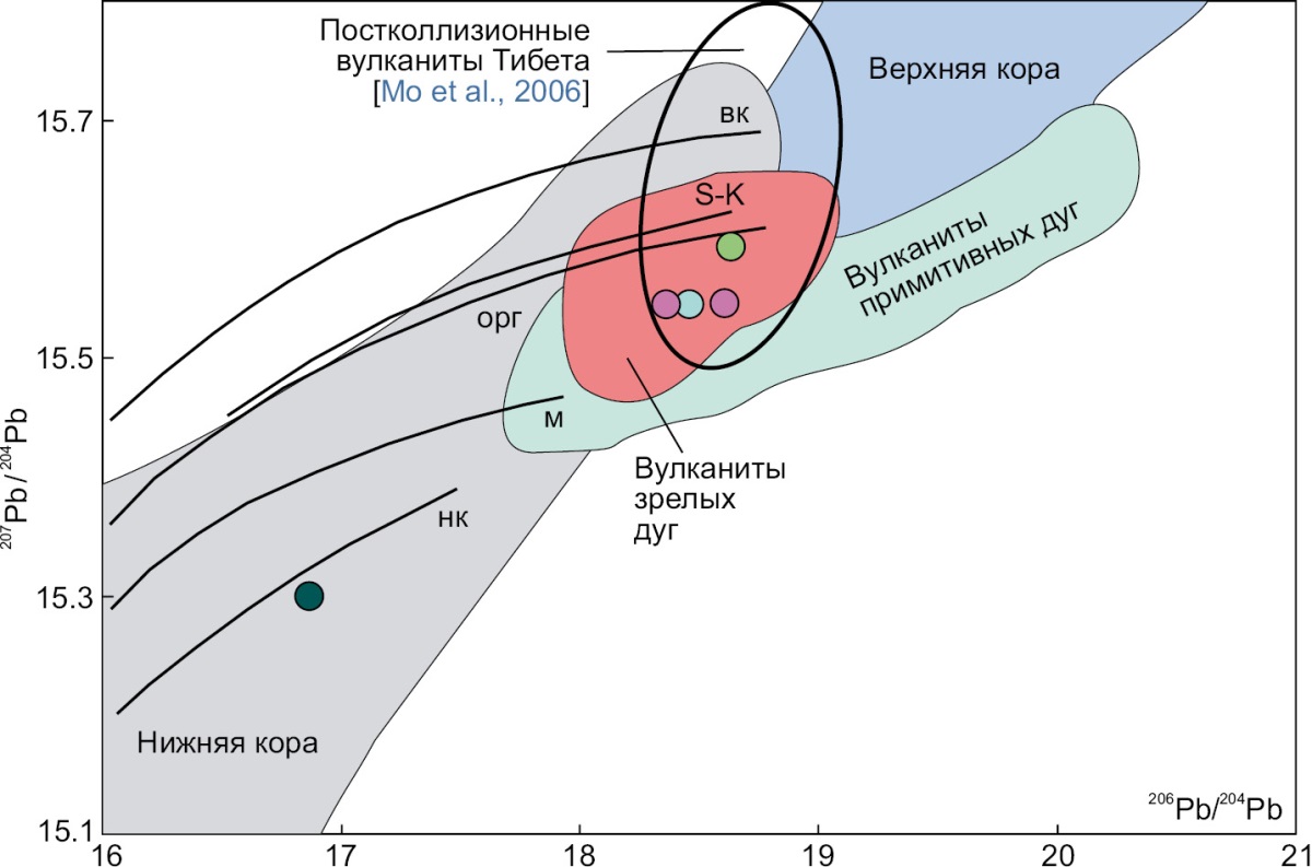 Нанесенные линии обозначают эволюцию свинца в различных резервуарах: нк – нижнекоровом, м – мантийном, орг – орогенном, вк – верхнекоровом; S-K – линия эволюции земного свинца по двухстадийной модели [Stacey, Kramers, 1975]. Условные обозначения см. рис. 3.
