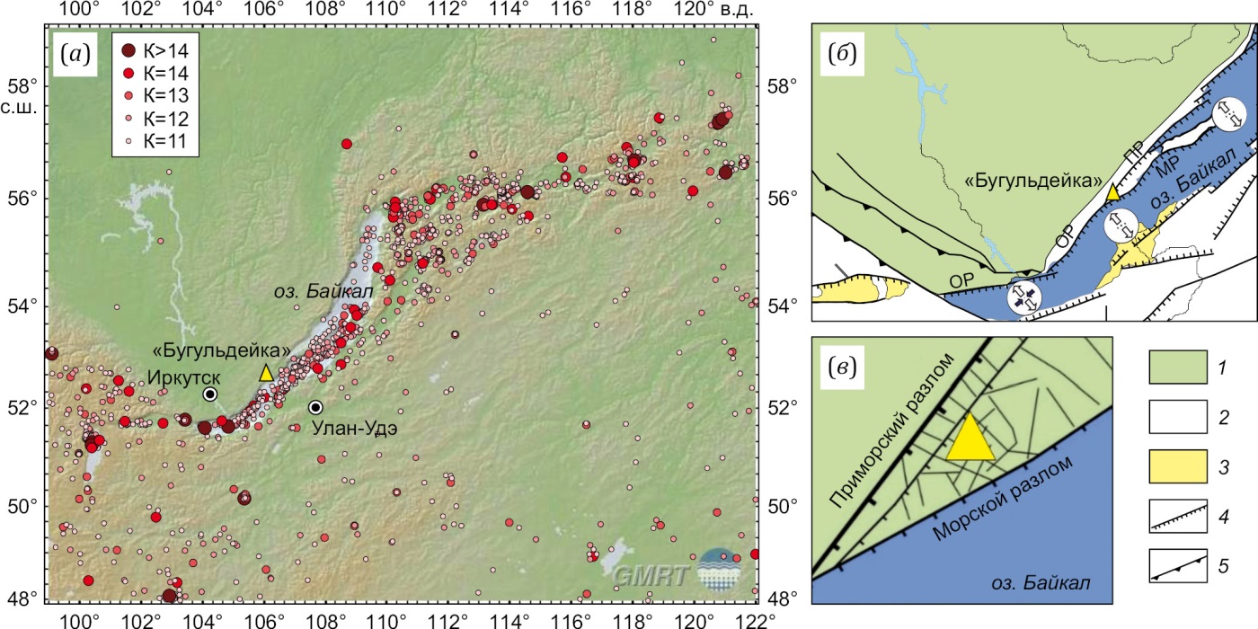 (a) – seismicity of the BRS with energy class K≥11 for the period from 1960 to 2024; (б) – scheme of neotectonic structures in the central part of the BRS; (в) – integrated monitoring of hazardous geological processes at the Buguldeyka site. The Buguldeyka site is shown by a yellow triangle. The letters indicate the names of the main rift-controlling faults: OР – Obruchevsky, ПР – Primorsky, МР – Morskoy; arrows in circle icons show the orientation of the compression and extension axes according to the earthquake focal mechanisms. 1 – Siberian Platform; 2 – Sayan-Baikal mobile region; 3 – sediments of the rift basins; 4–5 – faults: 4 – normal faults, 5 – reverse faults.