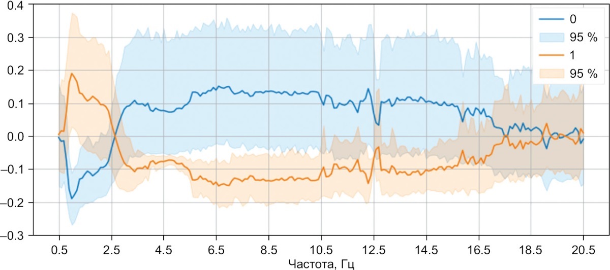 Чтобы получить представление о характеристиках и закономерностях в записях микросейсмического шума, нами был проведен разведывательный анализ данных (EDA). Согласно полученным результатам, за несколько часов перед землетрясениями наблюдается статистически значимое увеличение уровня МСШ в частотном диапазоне 0.5–2.5 Гц, в то время как на более высоких частотах – от 4 Гц до 16 Гц – картина обратная – уровень МСШ понижается. На остальных частотах уровень МСШ для активных и неактивных участков одинаковый. Это коррелирует с данными, полученными в работах [Korol et al., 2022; Dobrynina et al., 2023]. На рис. 3 представлены усредненные нормализованные спектры МСШ перед землетрясениями относительно спокойного фона.