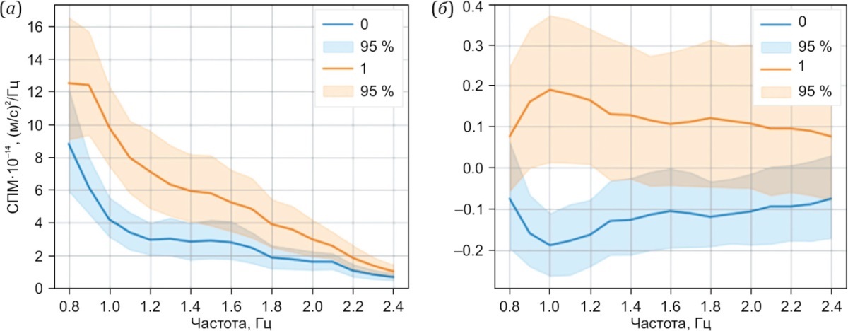 Для оценки СПМ использовался метод периодограмм Уэлча на 10-минутных участках записи микросейсмического шума. Параметры периодограмм: длительность сегментов 10 секунд с перекрытием 50 %, значения СПМ медианные. Это позволило получить оценки СПМ с шагом 0.1 Гц.