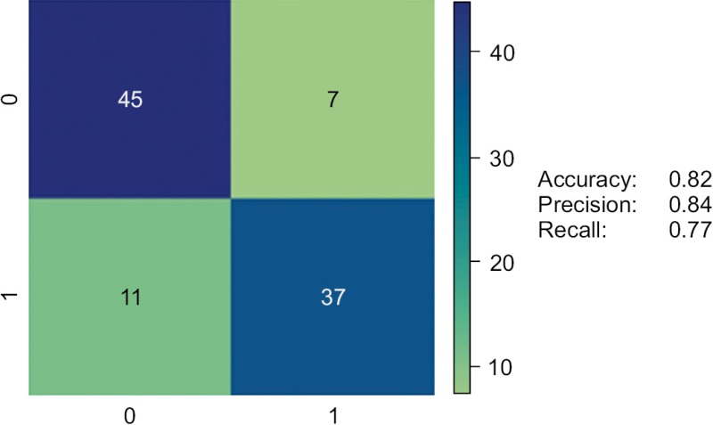 Матрица ошибок отображает статистику, полученную при тестировании модели. Тестирование производилось на ста образцах МСШ, не участвовавших в обучении. В двух верхних клетках приведено количество неактивных образцов, правильно определенных – 45 и неправильно определенных – 7. В нижних клетках количество активных образцов, правильно определенных – 37 и неправильно определенных – 11. Метрика accuracy равна доле правильно классифицированных образцов, precision можно интерпретировать как долю образцов, названных моделью активными и при этом действительно являющихся активными, а recall показывает, какую долю активных образцов из всех активных образцов нашла модель.