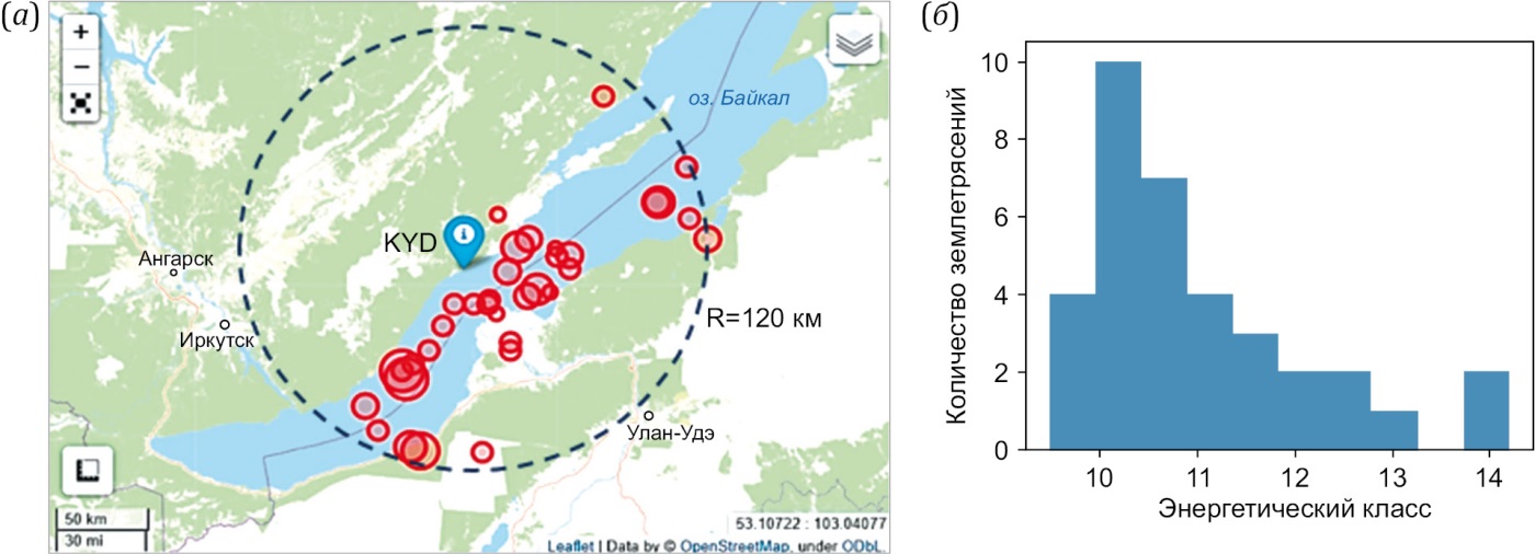 Для анализа были выбраны 40 землетрясений различного энергетического диапазона (K=9.5–14.9, М=3.1–5.9), зарегистрированных широкополосной сейсмической станцией KYD на эпицентральных расстояниях от 10 до 120 км (рис. 2). Указанные землетрясения в основном локализованы в зоне влияния Обручевского, Морского и Приморского разломов (кинематический тип – сброс), ограничивающих Южнобайкальскую впадину с запада, небольшая часть землетрясений сосредоточена в пределах восточного борта впадины (см. рис. 1, а). Выбранная область характеризуется как область чистого растяжения (pure extension zone): ось напряжений сжатия близвертикальна, оси напряжений растяжения ориентированы вкрест основным рифтовым структурам [Radziminovich et al., 2019] (см. рис. 1, б). Радиус 120 км охватывает сейсмические события, происходящие в зонах влияния этих разломов, предоставляя полный набор данных для анализа закономерностей и поиска предвестников будущих землетрясений, которые могут повлиять на регион. Тестовые испытания модели МО с разными наборами данных показали, что радиус 120 км обеспечивает оптимальный баланс, гарантируя достаточность данных без ущерба для релевантности и точности модели, в то время как выбор большего радиуса может внести дополнительные помехи, включив данные из областей с различными сейсмическими характеристиками, что потенциально снизит точность прогнозирования наших моделей.