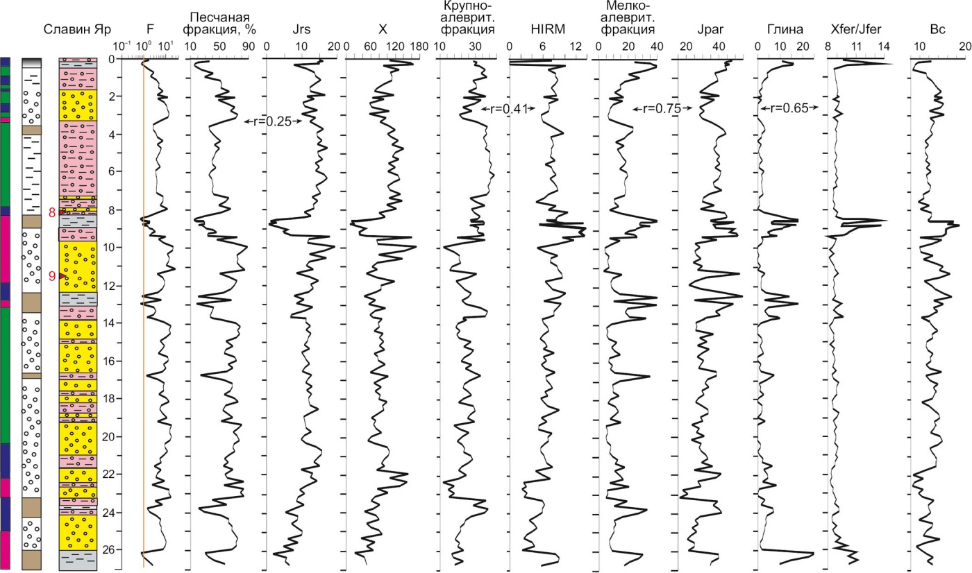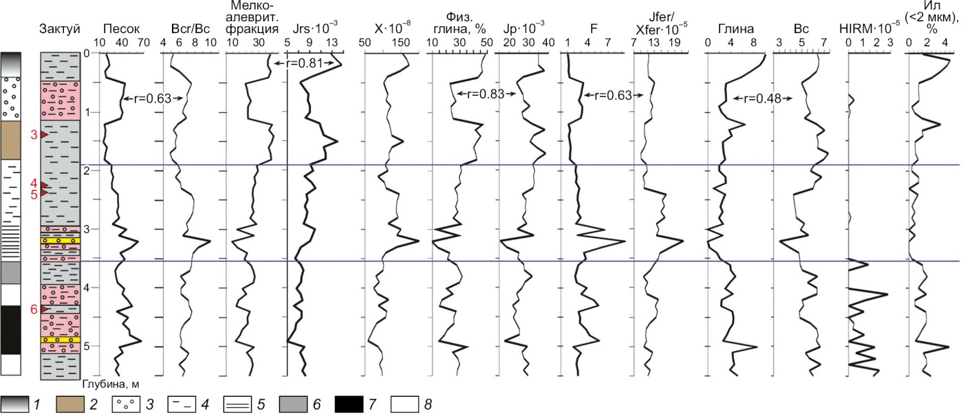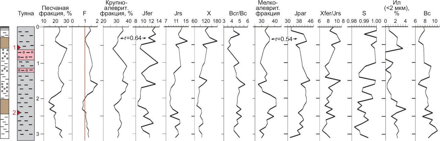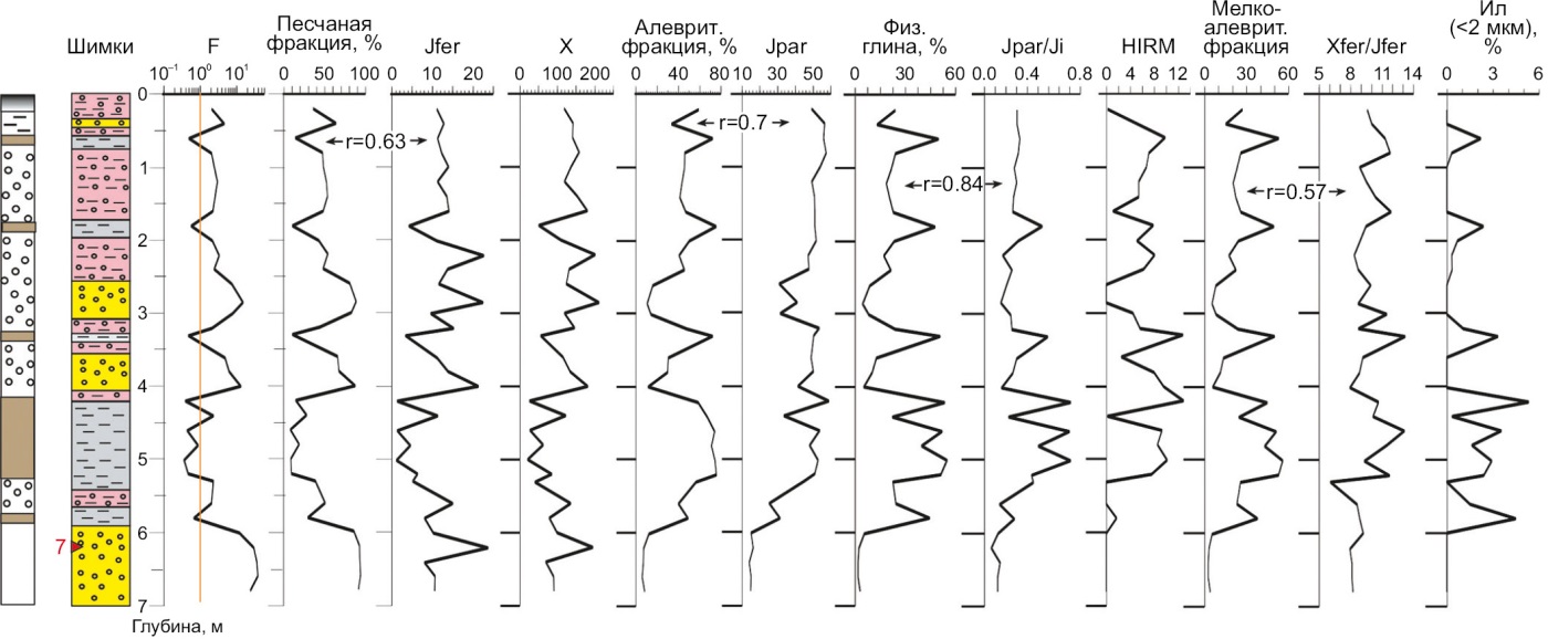 Общая картина результатов корреляционного анализа свидетельствует о слабой взаимосвязи магнитных характеристик с крупнозернистыми фракциями по причине неравномерного поступления фракций физического песка в высокодинамичной обстановке при участии делювиальных процессов и, вследствие этого, неустойчивого, незакономерного обогащения осадков магнитными минералами. В относительно спокойных условиях (разрез Шимки) эта связь сразу становится заметной. Корреляция парамагнитных, коэрцитивных и структурно-чувствительных параметров, отражающих содержание наиболее тонкозернистых магнитных минералов, с количеством мелкозернистых фракций (даже с учетом их малого количества) указывает на более равномерное поступление/новообразование магнитных минералов в составе этих фракций.