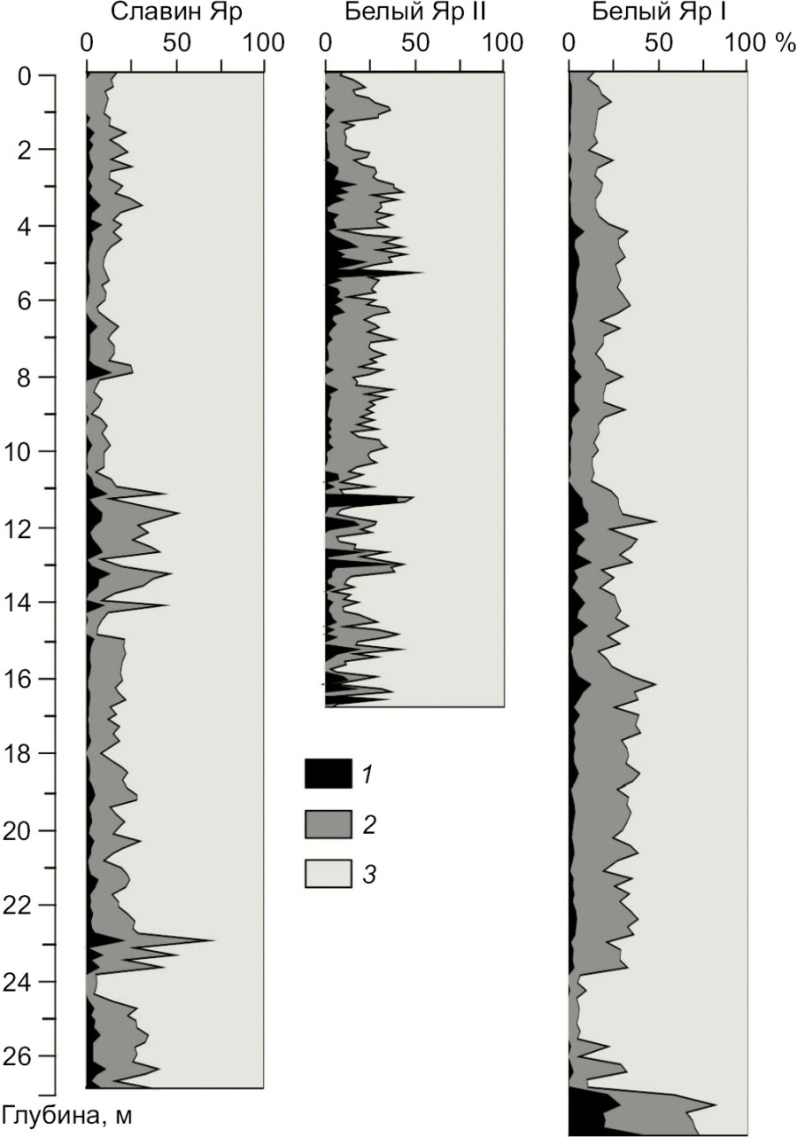 Поскольку отложения этих трех разрезов содержат более 50 % песка, целесообразно в них рассмотреть состав песчаной фракции (рис. 3). В целом, наибольший объем составляет мелкозернистый песок (100–250 мкм). Но в отдельных слоях доля крупнозернистого песка (>500 мкм) достигает 21 % в Славином Яру, 42 % – в Белом Яру I и 46 % – в Белом Яру II. Доля среднезернистого песка в среднем приблизительно одинакова: в Белых Ярах 19–22 %, в Славином Яру – чуть меньше (16 %).
