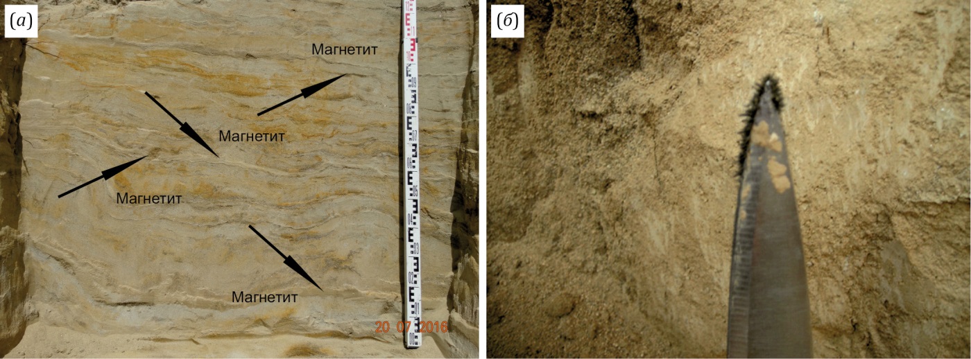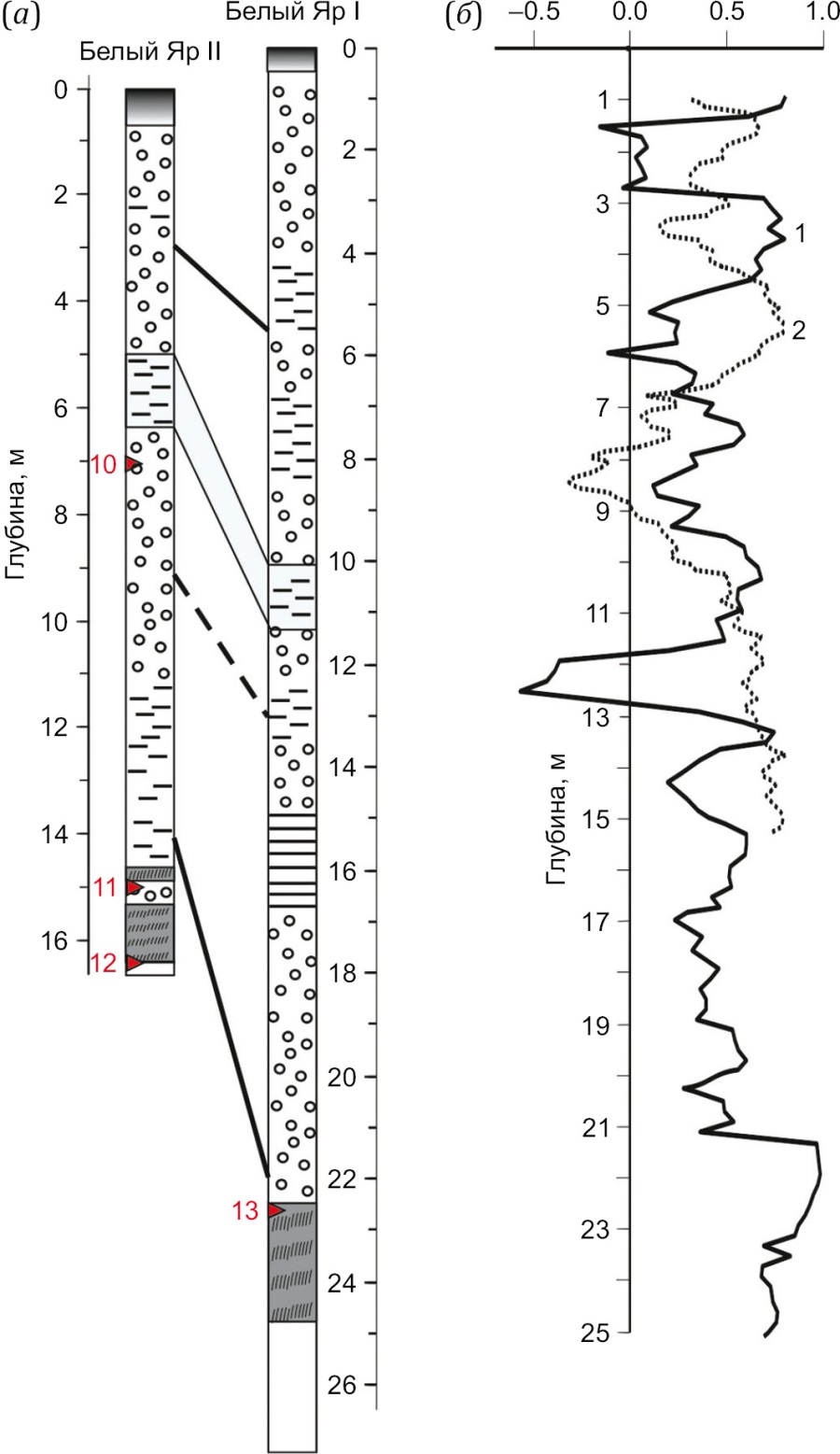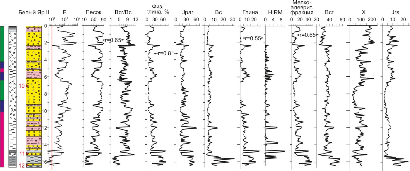 2) отложения разрезов Белый Яр I и II, наоборот, наиболее магнитны, в верхних частях разрезов (~ до 6.5 м) наблюдаются вкрапления магнетита в виде невыдержанных прерывистых слойков шириной до 5–7 мм. Отложения наиболее магнитомягкие, с широким диапазоном размеров магнитных частиц и с наименьшим вкладом парамагнетиков. Изменения магнитных характеристик недостаточно четко отражают строение разрезов, поэтому для детального изучения отложений следует привлекать другие методы (гранулометрию, геохимию, микроморфологию). По некоторым магнитным характеристикам отложения Белых Яров схожи с отложениями Зактуя, частично – Шимков;