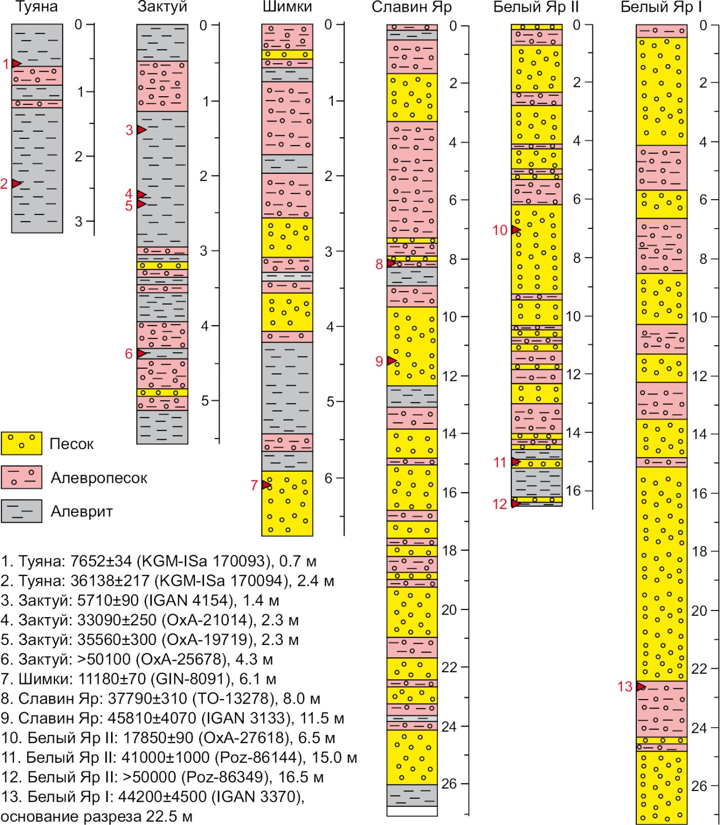 Среди ключевых разрезов верхнего плейстоцена Тункинского Прибайкалья наиболее представительными являются Белый Яр I, Белый Яр II, Славин Яр, Шимки, Туяна и Зактуй (рис. 1, б). Первые три разреза вскрывают отложения деформированного новейшими тектоническими процессами террасового комплекса дистальных частей впадин Тункинского рифта, вовлеченных в инверсионные воздымания. Разрезы Туяна и Зактуй также расположены на окраине Тункинской впадины в основании склона ее горного обрамления и представлены субаэральными отложениями преимущественно покровного лессовидного комплекса. При этом разрез Зактуй локализуется в зоне фациального перехода склоновых осадков борта котловины в отложения террасового комплекса р. Иркут, вскрывая одновременно и шлейф субаэральных накоплений, и аллювиальные образования тылового шва террасы. Разрез Шимки вскрывает строение первой надпойменной террасы р. Иркут.