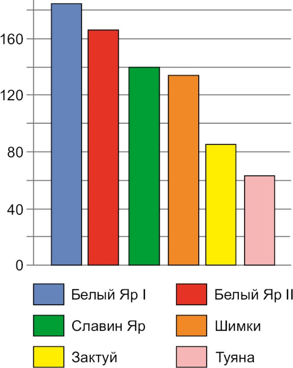 Белый Яр II | 2–62 | 0.01–0.88 | 1.7–12.7 | 2–40 | 7–11 | 3.8–190.0 | 19–121 |