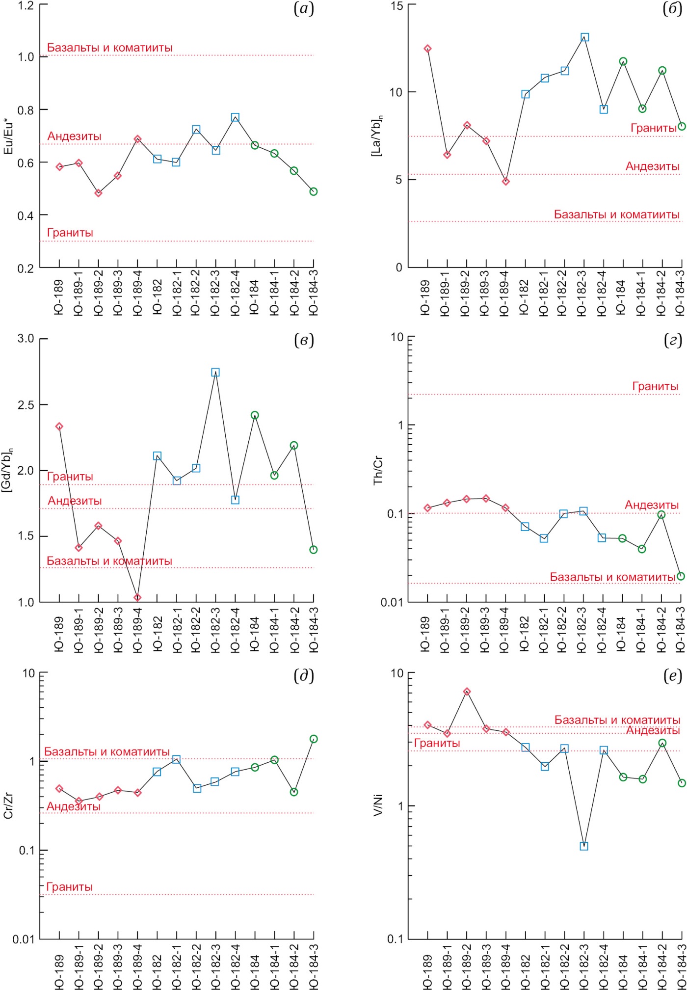 Fig. 10. Variation diagrams of trace-element ratios Eu/Eu*(a), [La/Yb]n (б), [Gd/Yb]n (в), Th/Cr (г), Cr/Zr (д), V/Ni (е) in siltstones of the Ildikan formation, sandstones and siltstones of the Gazimursky Zavod formation of the Yamkun series of the Argun continental massif and in the geochemical "reference" samples (Phanerozoic granites, Paleozoic basalts, komatiites and andesites after [Condie, 1993]). See Fig. 5 for legend.