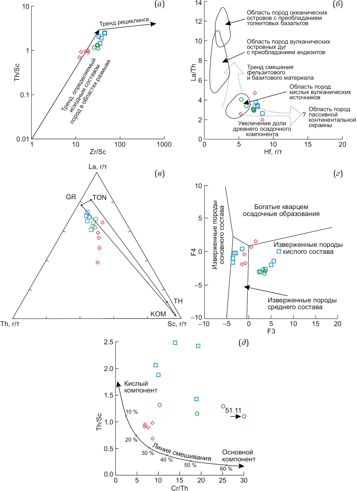Fig. 9. Diagrams Zr/Sc – Th/Sc [McLennan et al., 1993] (а), Hf – La/Th [Floyd, Leveridge, 1987] (б), Th – La – Sc [Wronkiewicz, Condie, 1987] (в), F3 – F4 [Roser, Korsch, 1988] (г), Cr/Th – Th/Sc [Bracciali et al., 2007; Totten et al., 2000] (д) for terrigenous rocks of the Yamkun series of the Argun continental massif. See Fig. 5 for legend. Abbreviations (в): GR – granites; TON – tonalites; TH – tholeiites; KOM – komatiites.