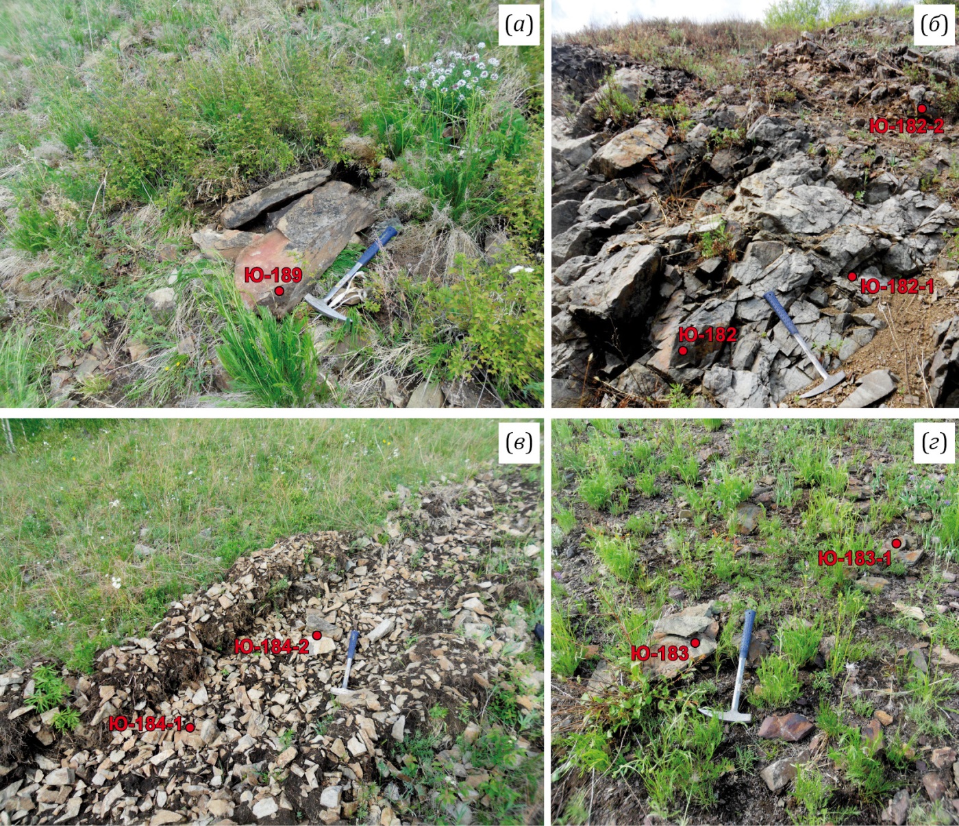 Объектом исследований являлись терригенные отложения ильдиканской и газимурозаводской свит ямкунской серии Аргунского континентального массива. Образцы пород ильдиканской свиты были отобраны из коренного обнажения, расположенного в бассейне р. Донинская Борзя (обр. Ю-189…Ю-189-4: 50°57'40.5" с.ш., 118°41'57.3" в.д. (рис. 3, а). Песчаники и алевролиты газимурозаводской свиты отобраны в междуречье Ильдикан – Кулинда (обр. Ю-182…Ю-182-4: 51°30'54.9" с.ш., 118°20'27.7" в.д. (рис. 3, б); обр. Ю-184–Ю-184-3: 51°30'27.4" с.ш., 118°20'11.5" в.д. (рис. 3, в); обр. Ю-183…Ю-183-4: 51°30'56.1" с.ш., 118°21'42.0" в.д. (рис. 3, г).