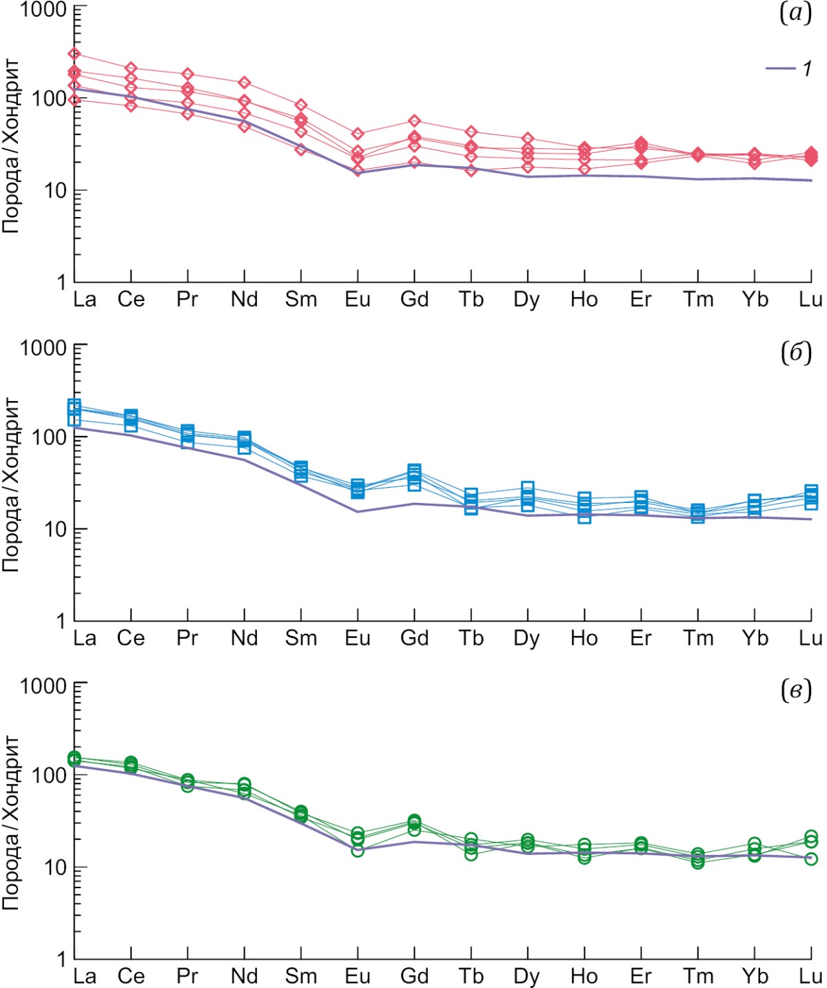 Fig. 7. The REE distribution pattern for siltstones of the Ildikan formation (a), sandstones (б) and siltstones (в) of the Gazimursky Zavod formation of the Yamkun series of the Argun continental massif. Chondrite composition after [McDonough, Sun, 1995]. 1 – upper continental crust composition after [Taylor, McLennan, 1985].