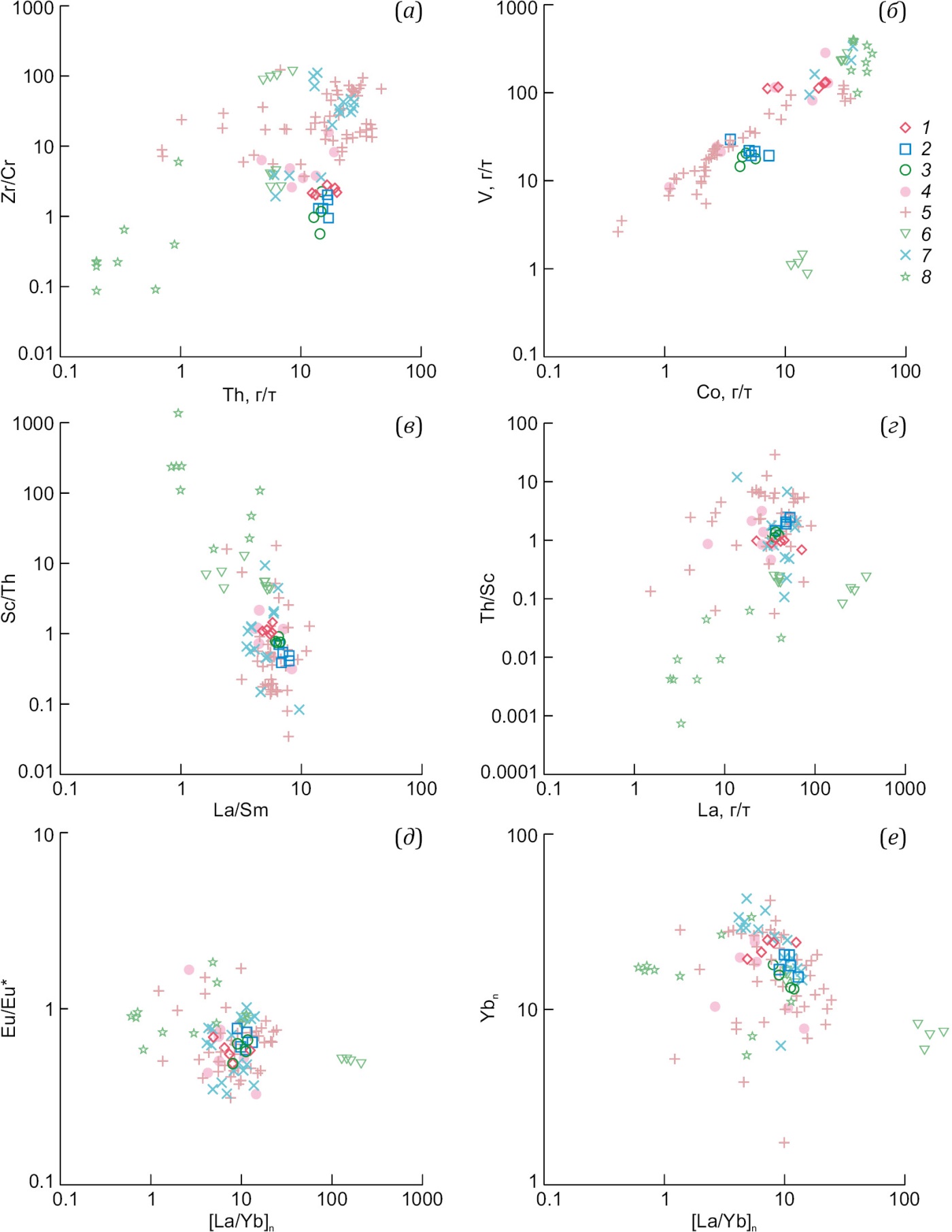 Fig. 11. Diagrams Th – Zr/Cr (a), Co – V (б), La/Sm – Sc/Th (в), La – Th/Sc (г), [La/Yb]n – Eu/Eu* (д), [La/Yb]n – Ybn (е) for terrigenous rocks of the Yamkun series of the Argun continental massif.