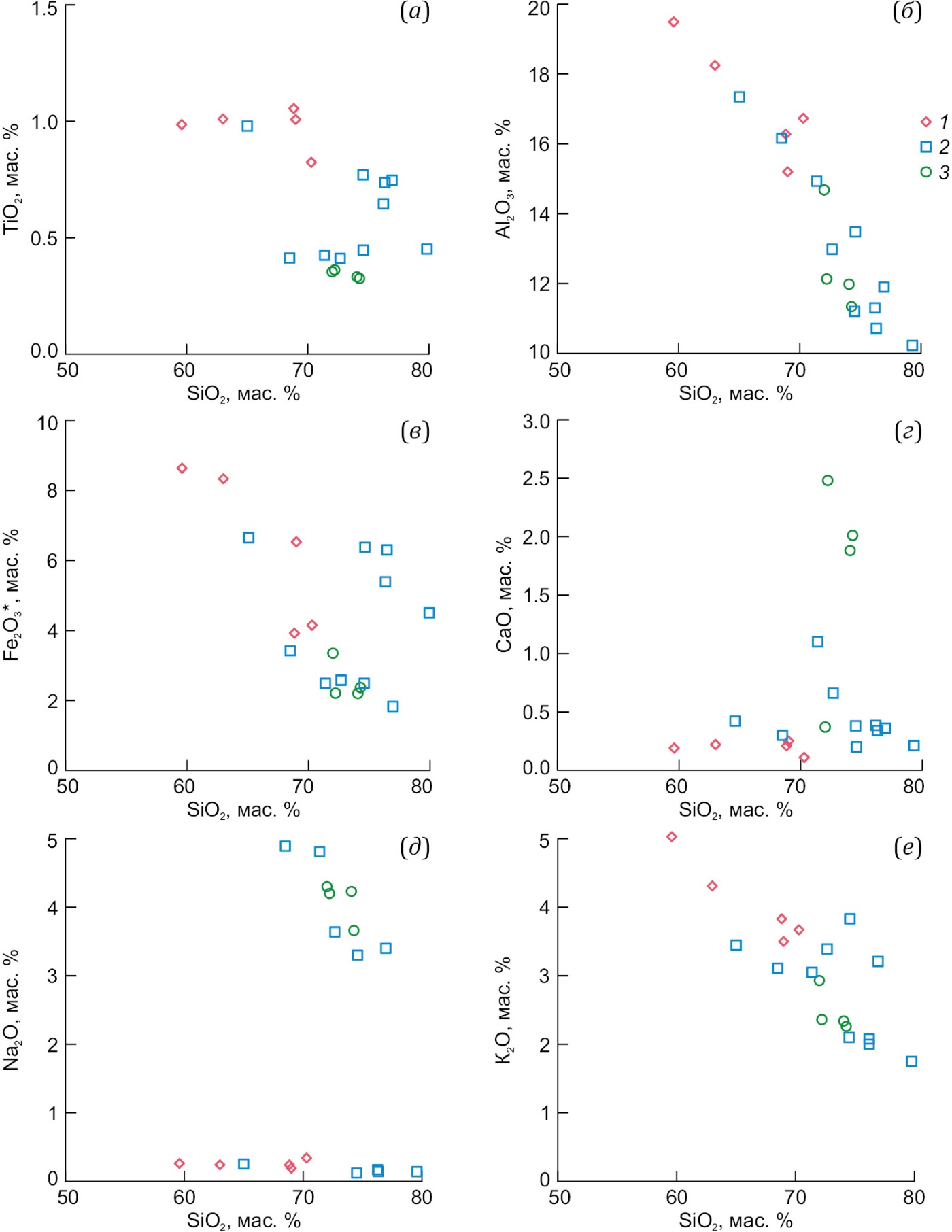 Fig. 5. Diagrams SiO2 – major oxides for terrigenous rocks of the Yamkun series of the Argun continental massif. 1 – siltstones of the Ildikan formation, 2 – sandstones, 3 – siltstones Gazimursky Zavod formation.