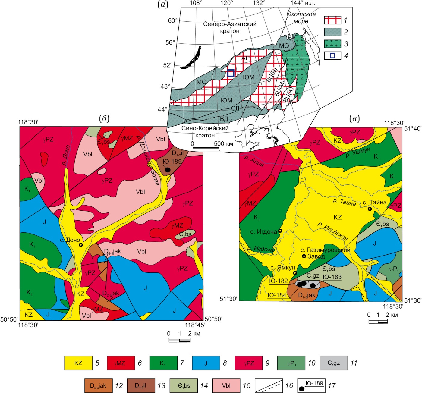 1 – continental massifs: АР – Argun; БЦ – Bureya–Jiamusi, terranes: Bureya (Б), Lesser Khingan (М), Khanka (Х), – Paleozoic – Early Mesozoic orogenic foldbelts: ЮМ – South Mongolian-Khingan, МО – Mongol-Okhotsk, СЛ – Solonker, ВД – Wundurmiao; 3 – Late Jurassic – Early Cretaceous foldbelts; 4 – study area; 5 – Cenozoic loose sediments; 6 – Mesozoic granites and leucogranites; – Cretaceous volcanosedimentary complexes; 8 – Jurassic sedimentary and volcanosedimentary rocks; 9 – Paleozoic granitoids; 10 – Early Permian gabbro; 11–13 – terrigenous and terrigenous-carbonate rocks of the Yamkun series: 11 – Lower Carboniferous Gazimursky Zavod formation, 12 – Middle-Upper Devonian Yakovlev formation, 13 – Lower-Middle Devonian Ildikan formation; 14 – Lower Cambrian terrigenous-carbonate deposits of the Bystraya formation of the Argun series; 15 – Vendian terrigenous-carbonate rocks of the Beletuy formation of the Byrka series; 16 – faults; 17 – sampling sites for geochemical studies and their numbers.