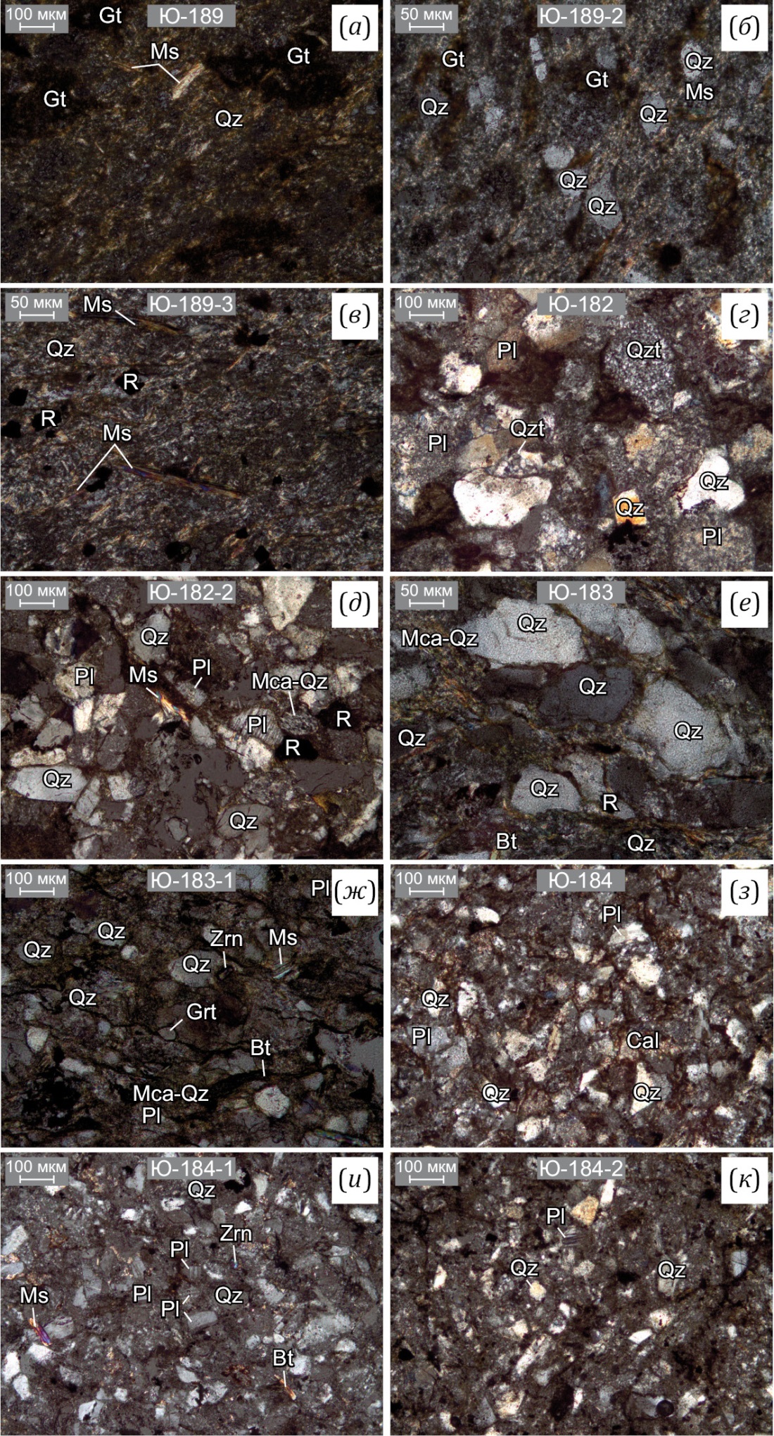 Fig. 4. Micrographs of sedimentary rocks from the Ildikan (a–в) and Gazimursky Zavod (г–к) formations of the Yamkun series of the Argun continental massif. The sample numbers correspond to those in the text and in the tables. Qz – quartz, Qzt – quartzite, Pl – plagioclase, Ms – muscovite, Bt – biotite, Mca-Qz – mica-quartz schists, Cal – calcite, Gth – goethite, R – ore minerals, Zrn – zircon, Grt – garnet.