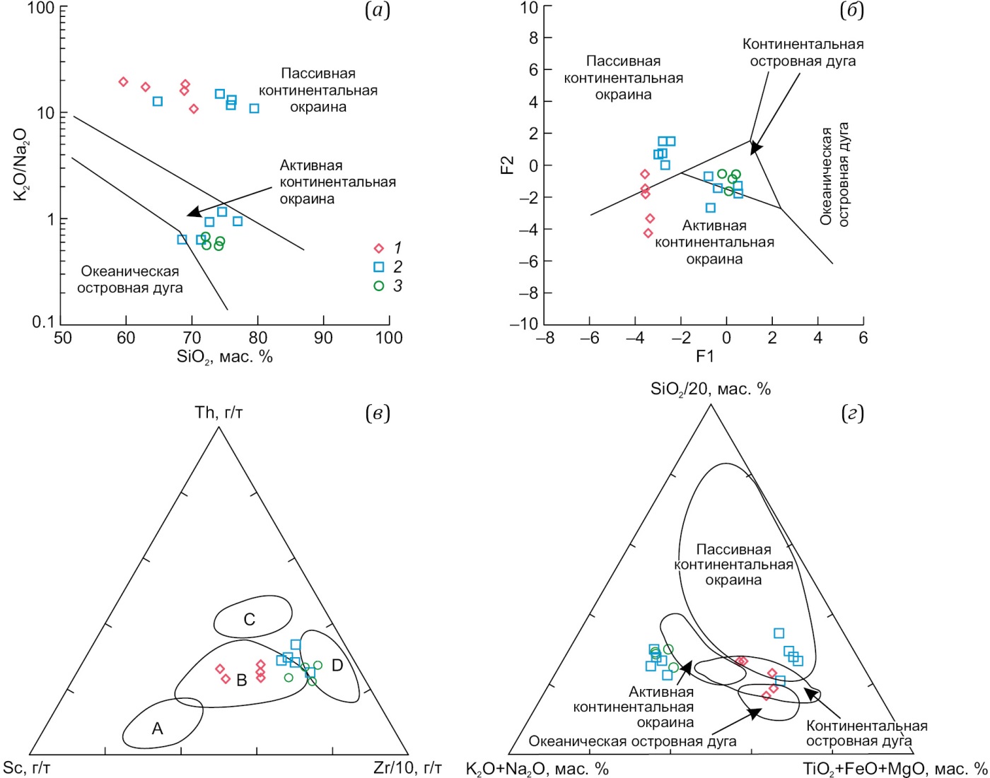 Fig. 12. Diagrams SiO2 – K2O/Na2O [Roser, Korsch, 1986] (а), F1 – F2 [Bhatia, 1983] (б), Sc – Th – Zr/10 [Bhatia, Crook, 1986] (в), (K2O+Na2O) – SiO2/20 – (TiO2+FeO+MgO) [Kroonenberg, 1994] (г) for terrigenous rocks of the Yamkun series of the Argun continental massif. 1 – siltstones of the Ildikan formation, 2 – sandstones, 3 – siltstones of the Gazimursky Zavod formation. Fields characterizing terrigenous rocks from tectonic settings (в): A – oceanic island arcs, B – continental island arcs, C – active continental margins, D – passive continental margins.