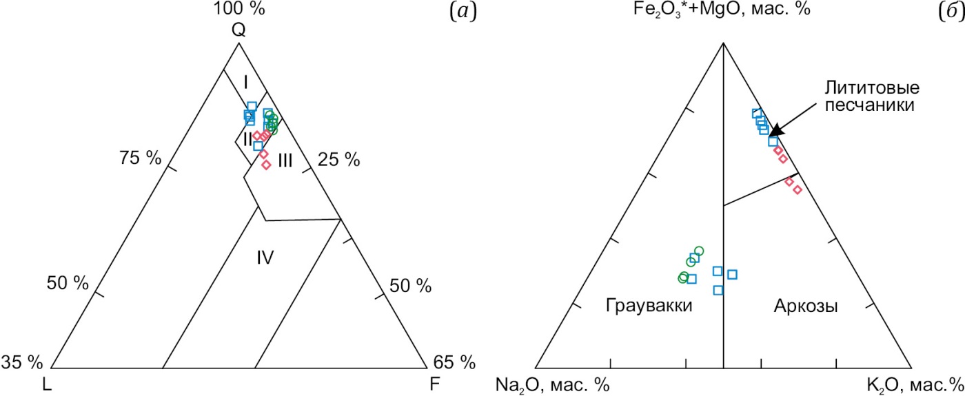 Рис. 6. Диаграммы L – Q – F [Kossovskaya, Tuchkova, 1988] (а), Na2O – (Fe2O3*+MgO) – K2O [Blatt et al., 1972] (б) для терригенных пород ямкунской серии Аргунского континентального массива. Условные обозначения на рис. 5. Поля песчаников (а): I – кварцевых, II – олигомиктовых, III – полимиктовых, IV – вулканокластитовых.
