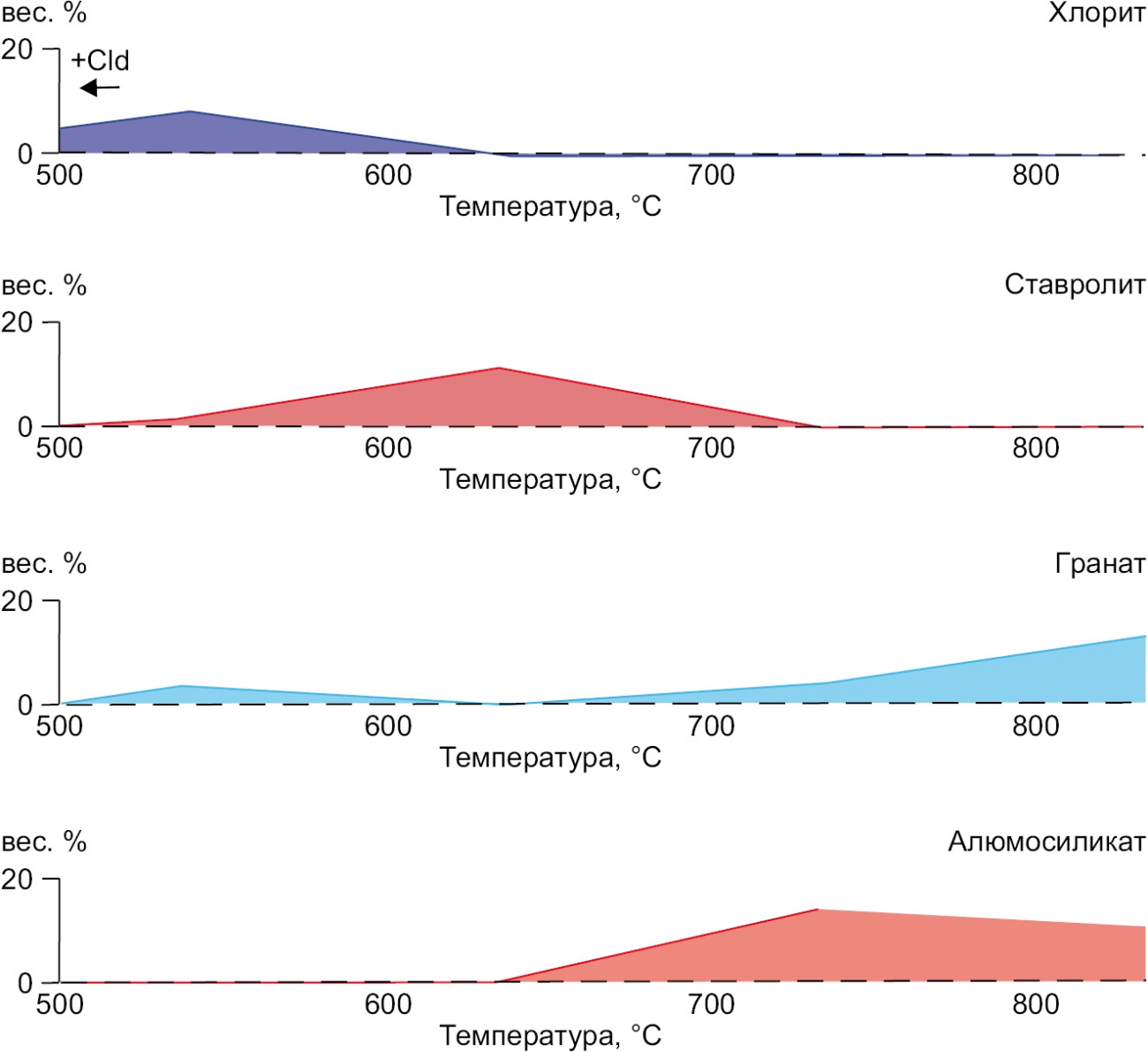 Следует обратить внимание на смену по латерали (см. рис. 2) таких глиноземистых Fe-Mg минералов, как хлоритоид, хлорит, ставролит. Такая последовательность (хлоритоид–>хлорит–>ставролит) смены минеральных ассоциаций в породах вполне согласуется с прогрессивным рядом минералообразования, связанным с ростом температуры. Этот ряд минералообразования подтверждают и термодинамические расчеты появления указанных минералов при росте температуры (рис. 14).