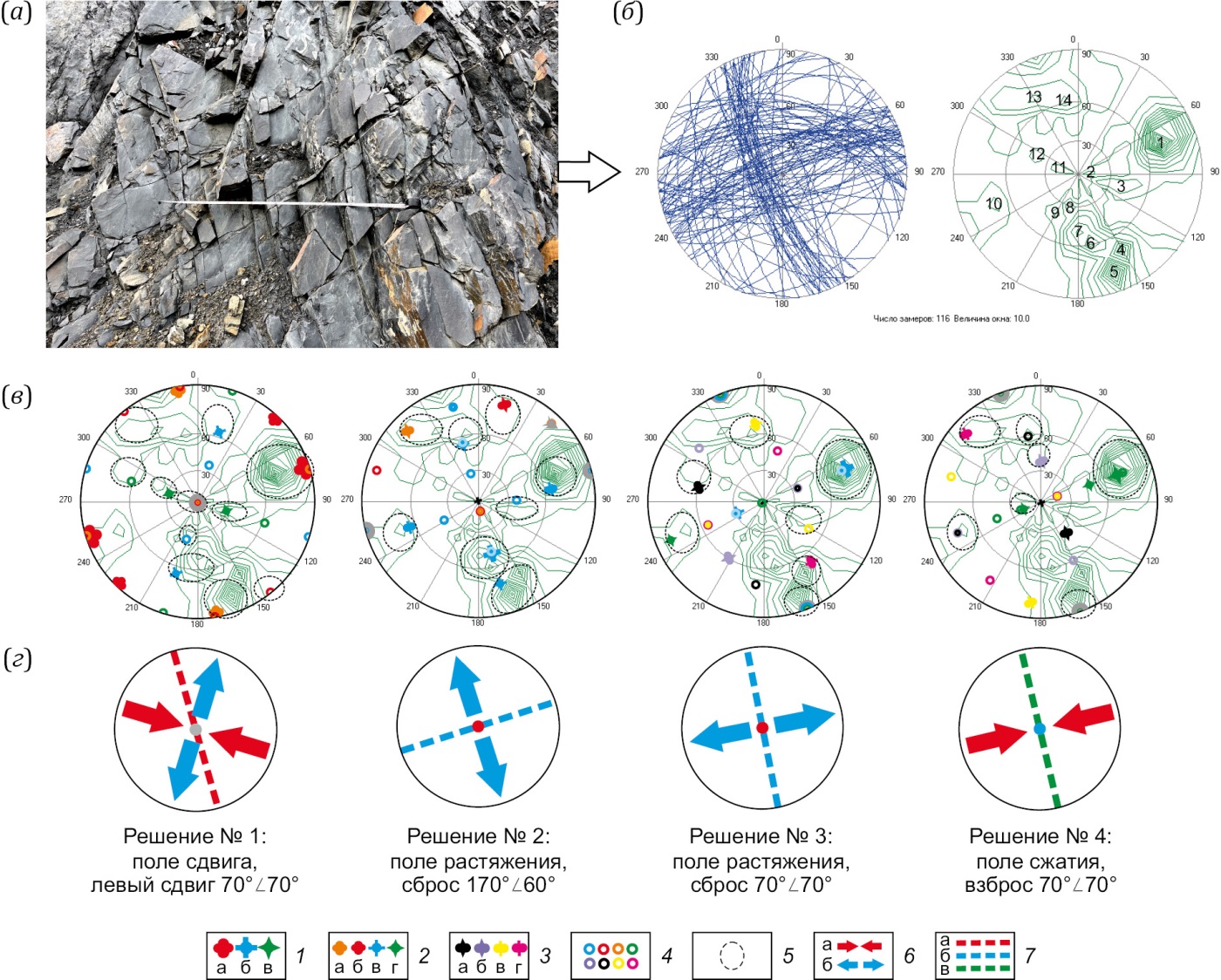 (а) – fracturing network photographs; (б) – 116 fracture measurement points on the upper hemisphere in planes (left) and poles with fracture system numbers (right) (here and further on – upper hemisphere, Wulff net, averaging window size – 10°); (в–г) – result of comparing the diagram to standard patterns in the form of four final local solutions on dynamic settings for the left-lateral shear (soln. No. 1), two normal fault (solns No. 2, 3) and reverse fault (soln. No. 4) zones (в) and corresponding shear, extension and compression stress tensors (г).