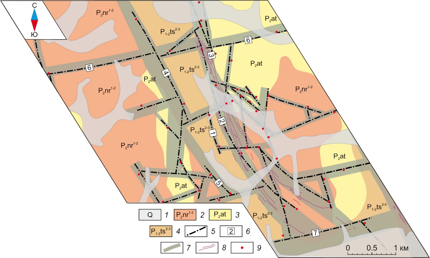 1 – contours of the study area; 2 – geologiocal-structural observation point and its number; 3 – paragenetic analysis solution on the altitude (dip and strike) and type of the local-rank fault zone reconstructed in the observation points with a high (а), moderate (б) and low (в) degree of certainty: line – a zone strike azimuth, figure – a dip angle (shown from the hanging wall side); color – a morphogenetic type of zone; 4 – fault zones mapped as fracture zones (а), fracture zones with slickensides on some large fault surfaces (б), crush zones less than 0.15 m thick (в), crush zones 0.15–1.00 m or more thick (г) (morphogenetic type of a zone); 5 – mapped inclined (а) (figure – a dip angle) and sub-vertical (б) bedding fault zone; 6 – morphogenetic type of the mapped fault zones: а – normal faults, б – reverse faults – thrusts, в – left-lateral shears, г – right-lateral shears, д – different-type at certain stages of development.