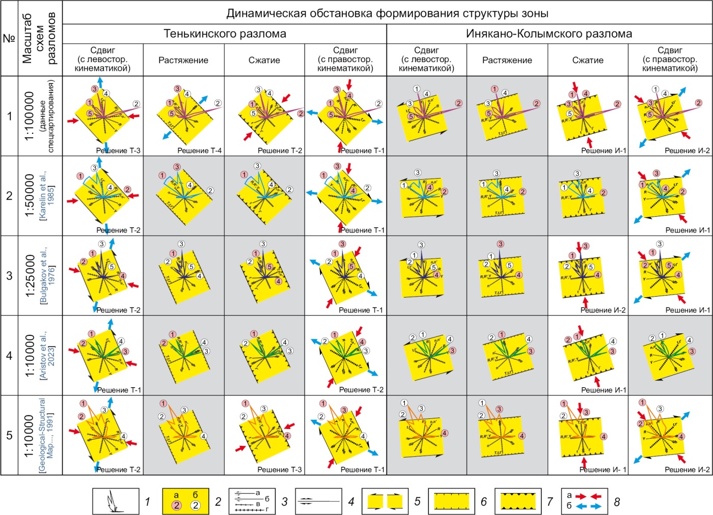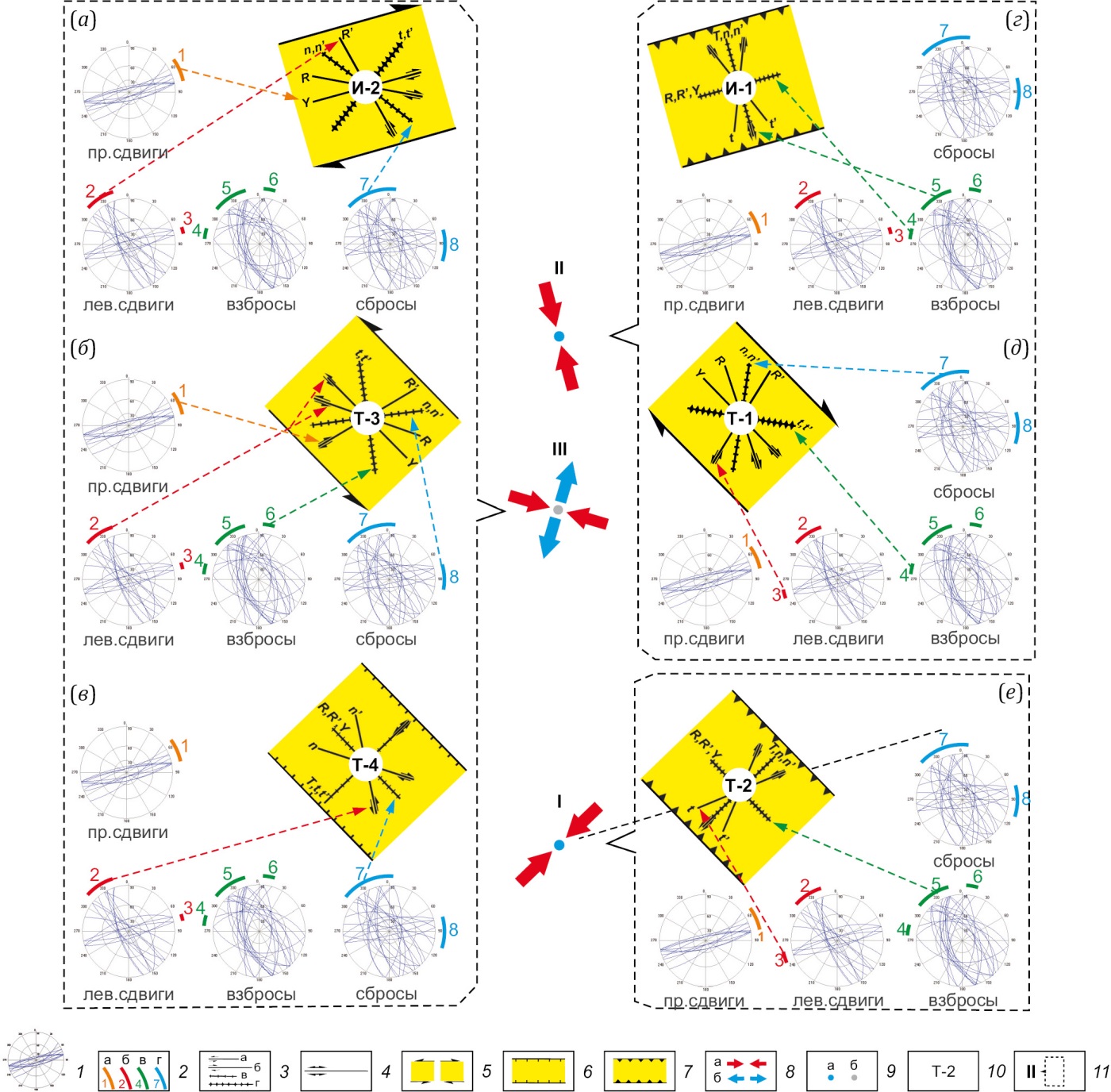 1 – poles of the left-lateral (а), normal (б) and reverse (в) fault planes of the 1st order planes; 2 – poles of the right-lateral (а), left-lateral (б), normal (в) and reverse (thrust) (г) fault planes of the 2nd order; 3 – poles of the planes of the mixed-type faults of the 2nd order: left-lateral (а) and right-lateral (б) strike-slip fault or oblique-slip fault, left-lateral (в) and right-lateral (г) reverse-slip or slip-reverse fault; 4 – poles of the secondary or additional system of small faults of the 3rd order; 5 – contour in which the fracture system, drawn with isolines on the spherogram, coincides with the pole of the standard pattern fault system; 6 – direction of the principal normal stress axes during compression (а) and extension б); 7 – average position of the reconstructed left-lateral (а), normal (б) and reverse (в) fault zone axis.