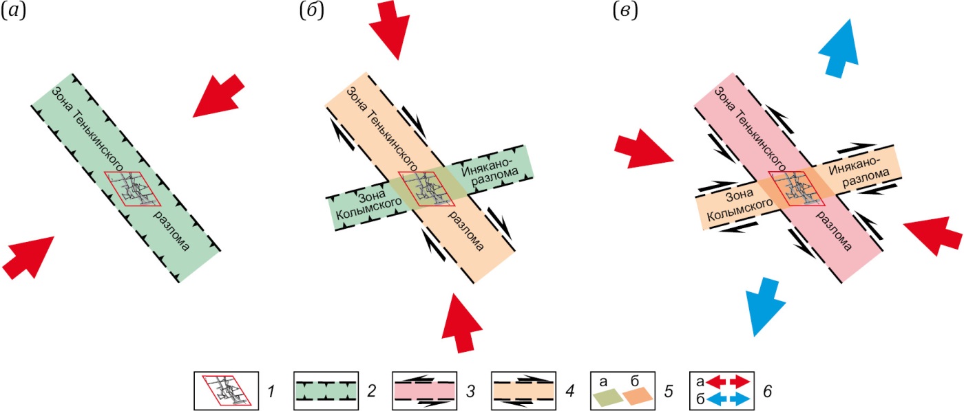 Сопоставление кинематики выявленных зон и решений о стресс-тензорах в отдельных пунктах наблюдений стало основой для реконструкции трех типов напряженного состояния регионального уровня, которые соответствуют главным этапам формирования структуры разломного узла. В обстановке сжатия, направленного с северо-востока на юго-запад, по продольным разрывам Тенькинской зоны происходили взбросовые движения. В обстановке субмеридионального сжатия подобные перемещения имели место в Инякано-Колымской зоне, тогда как разломы тенькинского направления являлись правыми сдвигами.
