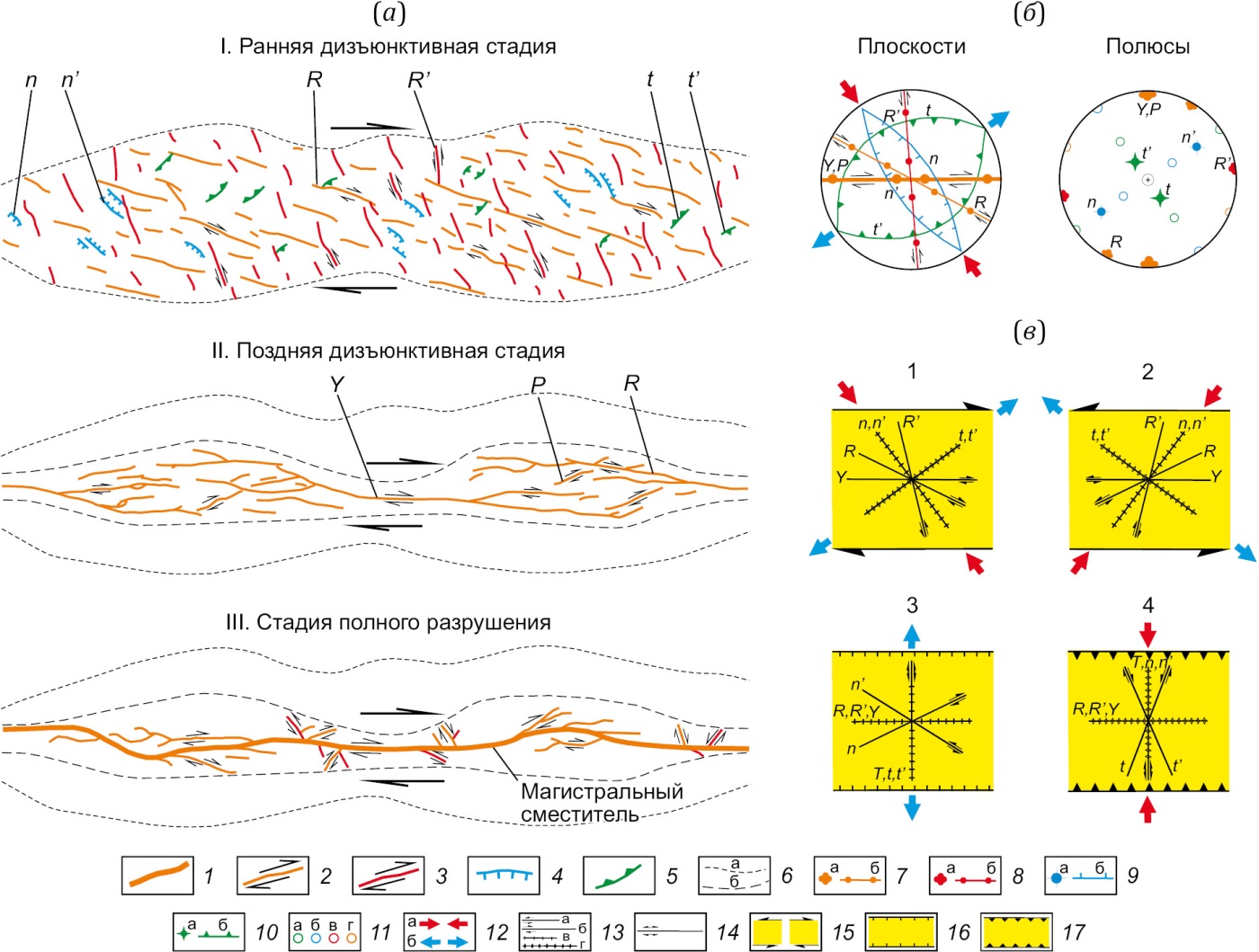 (а) – строение разломной зоны на трех главных стадиях развития (I–III): 1 – магистральный сместитель (разрыв 1-го порядка); 2 – правые сдвиги; 3 – левые сдвиги; 4 – сбросы; 5 – взбросы (надвиги); 6 – границы зоны разрывов, активных на стадии I (а) и II (б).