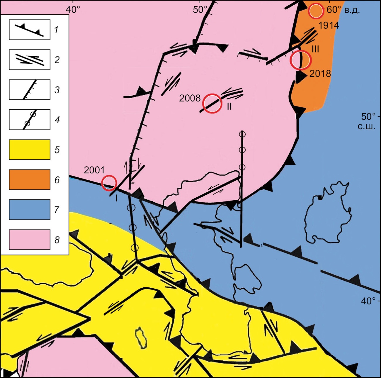 Fig. 1. Main deformation lines in the eastern European part of the Eurasian Plate and its framing (after [Leonov et al., 2001; Kopp, 2004]). Deformation zones: 1 – compression, 2 – shear, 3 – extension, 4 – deformation lines according to seismological data; main geostructures: 5 – Alpine, 6 – Hercynian, 7 – Epihercynian, 8 – Precambrian. Seismogenerating structures: I – Salsk, II – Shalkar-Aksay, III – Bakal-Satka. Red circles show earthquakes with a magnitude of 5 or higher, with year.